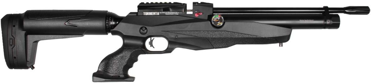 Reximex Tormenta, nowoczesna wiatrówka PCP w kompaktowej, taktycznej osadzie z chwytem pistoletowym wykonanej z wytrzymałego polimeru. Karabin wyposażony został w dźwignię napinania Side Lever, regulowaną stopkę, pojemny podwójny kartusz, gwintowaną lufę.