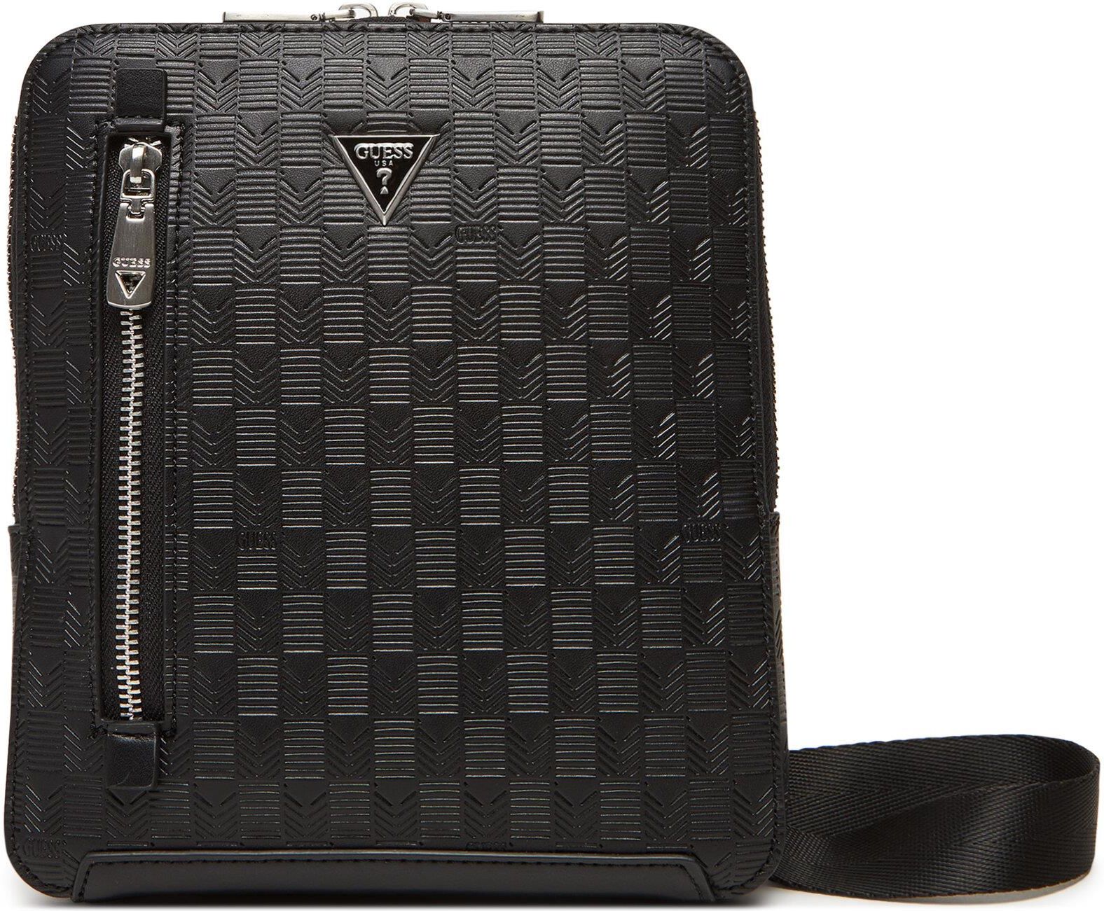 Czarna saszetka męska marki Guess, wykonana z wysokiej jakości skóry ekologicznej. Wyposażona w jedną komorę, jedną wewnętrzną kieszeń na zamek oraz trzy wsuwane kieszenie na karty. Dodatkowo posiada jedną kieszeń zapinaną na zamek z przodu i jedną niezapinaną z tyłu. Regulowany pasek zapewnia wygodę noszenia.