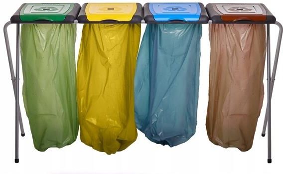 Stojak na worki do segregacji śmieci 4 komorowy Stelaż wykonany z mocnej rurki o średnicy 20 mm w kolorze szarym Klapa główna wykonana z wysokoudarowego tworzywa sztucznego w kolorze czarnym mocuje się na stelażu każda osobno do której jest WPINANY worek dzięki czemu on nawet napełniony pozostaje na swoim miejscu Klapa zamykana wykonana z wysokoudarowego tworzywa sztucznego w kolorach czarny - odpady zmieszane, żółty - tworzywa sztuczne i metale, niebieski - papier, zielony - szkło i brązowy - odpady biologiczne Parametry Długość - 148 cm Szerokość - 37 cm Wysokość - 84 cm UWAGA: przy zakupie stojaka proszę podawać kolor klap w wiadomości do sprzedającego w przypadku braku takiej wiadomości kolory będą wybrane losowo