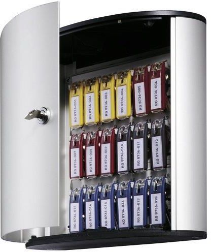 Aluminiowa skrzynka na klucze KEY BOX o ponadczasowym wzorze. Drzwiczki otwierają się pod kątem ponad 90° umożliwiając wygodny dostęp do wszystkich kluczy. Na wewnętrznej stronie drzwiczek znajduje się miejsce do wsunięcia opisu zawartości skrzynki. Opis taki można wykonać przy pomocy bezpłatnego programu znajdującego się na stronie www.durable.pl Bezpieczeństwo zapewnia zamek wysokiej jakości z dwoma kluczami. W opakowaniu znajdują się śruby montażowe i instrukcja zawieszania skrzynki na ścianie. Innowacyjne zawieszki do kluczy KEY CLIP można łatwo powiesić nie zakrywając miejsca nadruku. Prosty opis etykiet na zawieszkach jest możliwy przy pomocy bezpłatnego programu znajdującego się na stronie www.durable.pl Skrzynka na klucze jest dostępna w 3 rozmiarach. Najmniejsza wersja jest na 12 kluczy, średnia na 18 i 36 lub 54 klucze, a największa na 48 lub 72 klucze. Do każdej skrzynki dołączone jest opakowanie z sześcioma przykładowymi zawieszkami na klucze KEY CLIP. Wymiary: 302 x 280 x 118 mm...