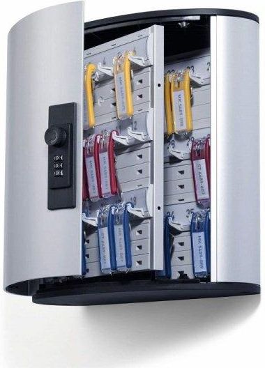Skrzynka na klucze z aluminium o wyjątkowym wzornictwie z zamkiem cyfrowymIndywidualne nastawienie kodu, do 1000 kombinacjiPojemność: na 36 zawieszek na klucze KEY CLIPSpecjalne listwy na klucze zapewniają pewne zawieszenie i optymalne dojście W kombinacji z zastosowaniem zawieszek na klucze KEY CLIP z przejrzystym okienkiem zapewniona szczególnie dobra orientacjaZmienna wysokość zawieszeniaWyraźny opis arkusza z wkładkami za pomocą EDPW tym 6 kolorowych zawieszek na klucze KEY CLIPMożliwość bezpłatnego pobrania materiału do opisu arkuszy z wkładkami i tym samym wkładek do KEY CLIPZ zestawem montażowymRodzaj zamka - zamek szyfrowyRodzaj zamka - z 3-cyfrowym zamkiem szyfrowymRodzaj etykiety - downloadPodstawa/typ montażu - montaż naściennySzerokość zewnętrzna (mm) - 302Wysokość zewnętrzna (mm) - 160Głębokość zewnętrzna/długość - 118 mmIlość wypełnienia/Ilość wypełnienia dla - 36 kluczMateriał podstawowy - aluminium...