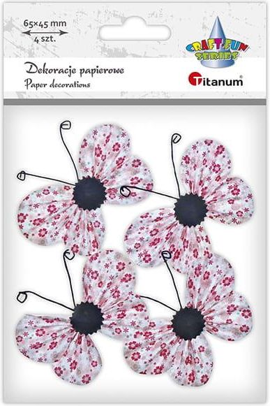 Aplikacje papierowe Motyle różowe 3D 65 x 45 mm 4 sztuki, Craft-Fun Dekoracje samoprzylepne papierowe, wzór: motyle, czułki z drucika, wymiar: 65 x 45 mm, kolor: białe w drobne róże. 4 sztuki. Kod produktu w systemie: - 5903714538027