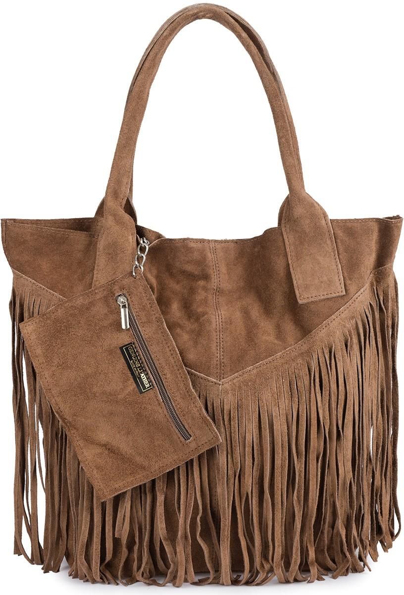 Torebka damska skórzana zamszowa A4 frędzel duża taupe L83 Tarczyn