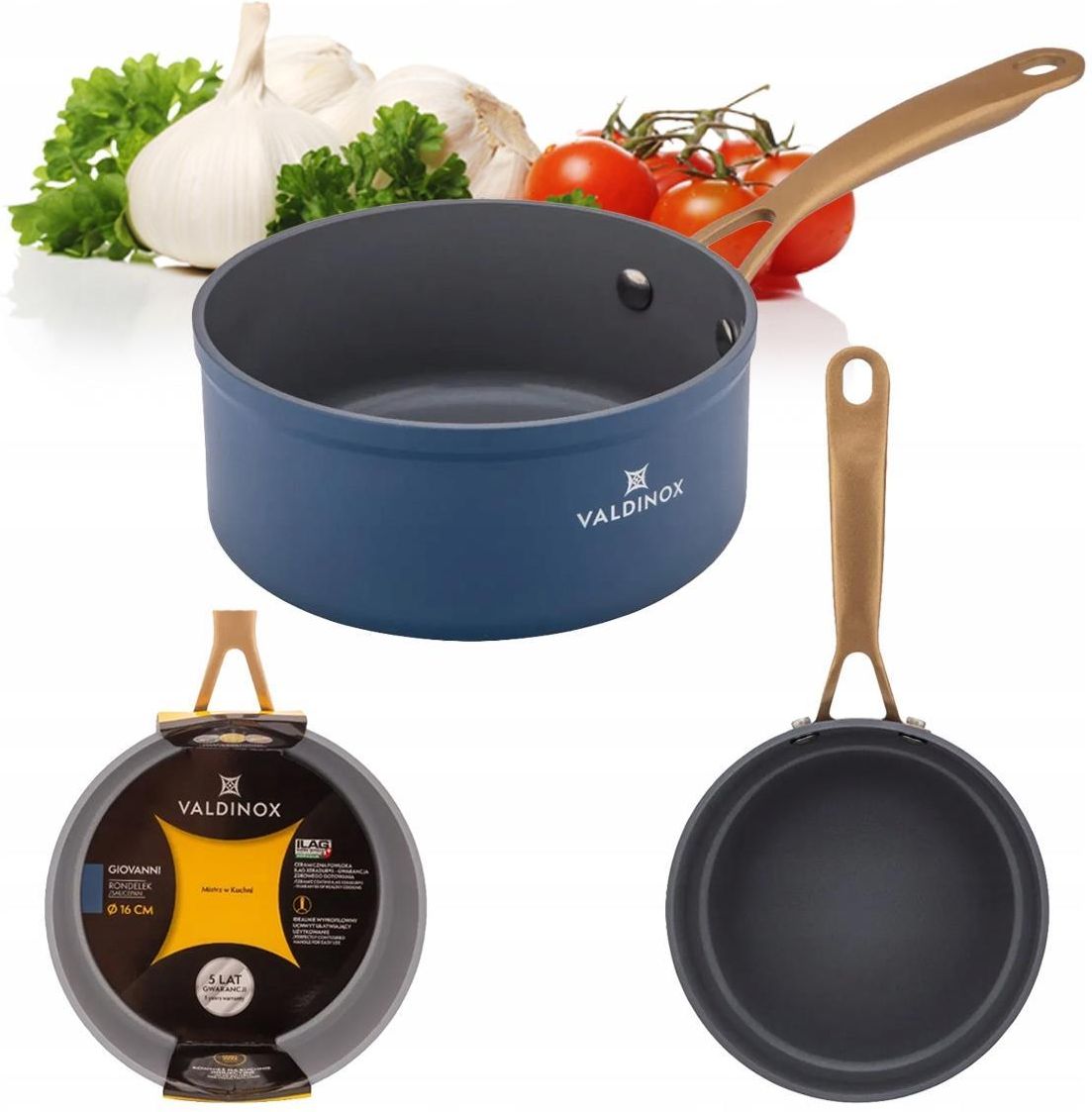VALDINOX GIOVANNI RONDEL 16CM 1.2L. NA IDUKCJĘ INDUKCJA Rondel 1,2 l Valdinox Giovanni - połączenie elegancji i funkcjonalności, które sprawdzi się w każdej kuchni. Valdinox - Mistrz w Kuchni! Dlaczego warto: Rondel Valdinox Giovanni został wykonany z aluminium. Jest niezwykle trwały i odporny na uszkodzenia. Posiada ceramiczną powłokę nieprzywierającą ILAG XERADUR®3*. Dzięki niej gotowanie jest zdrowsze, ponieważ nie wymaga dużej ilości tłuszczu. Gruby korpus równomiernie się nagrzewa i długo utrzymuje ciepło. Rondel nie zawiera mikroplastiku ani szkodliwych substancji. Jest bezpieczny zarówno dla zdrowia, jak i środowiska. Uchwyt wykonany z kutej stali nierdzewnej pokryty złotą powłoką dodaje elegancji i klasy Twojej kuchni. Rondel Giovanni można stosować na wszystkich rodzajach kuchenek, w tym indukcyjnej. Produkt objęty jest 5-letnią gwarancją, co świadczy o jego wysokiej jakości i niezawodności. *Powłoka ILAG XERADUR®3 to nowoczesna, wielowarstwowa powłoka ceramiczna, która łączy w sobie doskonałe właściwości nieprzywierające z wysoką odpornością na zarysowania. Dzięki niej możesz gotować zdrowo, używając minimalnej ilości tłuszczu, a jednocześnie cieszyć się łatwością czyszczenia garnka. ILAG XERADUR®3 jest całkowicie wolna od szkodliwych substancji chemicznych, takich jak PFOA, PTFE czy mikroplastik, co czyni ją bezpiecznym wyborem dla zdrowia oraz środowiska. Dodatkowo, ta powłoka zapewnia długą trwałość produktu, co pomaga zmniejszyć ilość odpadów w kuchni. Zdrowe gotowanie to podstawa świadomego stylu życia, a odpowiednie narzędzia w kuchni mogą znacząco wpłynąć na jakość przygotowywanych posiłków. Rondel Valdinox Giovanni to idealny wybór dla tych, którzy chcą cieszyć się zdrowymi potrawami, przy minimalnym użyciu tłuszczu i bez obaw o szkodliwe substancje. To idealne rozwiązanie dla osób ceniących zarówno elegancki design, jak i funkcjonalność w kuchni. Wykonany z najwyższej jakości materiałów, pozwala na przygotowywanie zdrowych i smacznych potraw z minimalną ilością tłuszczu. Dzięki zastosowaniu innowacyjnej powłoki ceramicznej ILAG XERADUR®3, jest nie tylko przyjazny dla środowiska, ale również bezpieczny dla zdrowia. Powłoka ceramiczna zapewnia wyjątkową odporność na zarysowania i ścieranie, co znacznie wydłuża żywotność rondla. Naczynie nie zawiera szkodliwych substancji, takich jak mikroplastik, co sprawia, że gotowanie staje się jeszcze zdrowsze i bardziej ekologiczne. Wyjątkowy design rondla to nie tylko kwestia estetyki, ale także praktyczności. Uchwyt z kutej stali nierdzewnej, pokryty złotą powłoką, nadaje rondlowi luksusowego charakteru.
