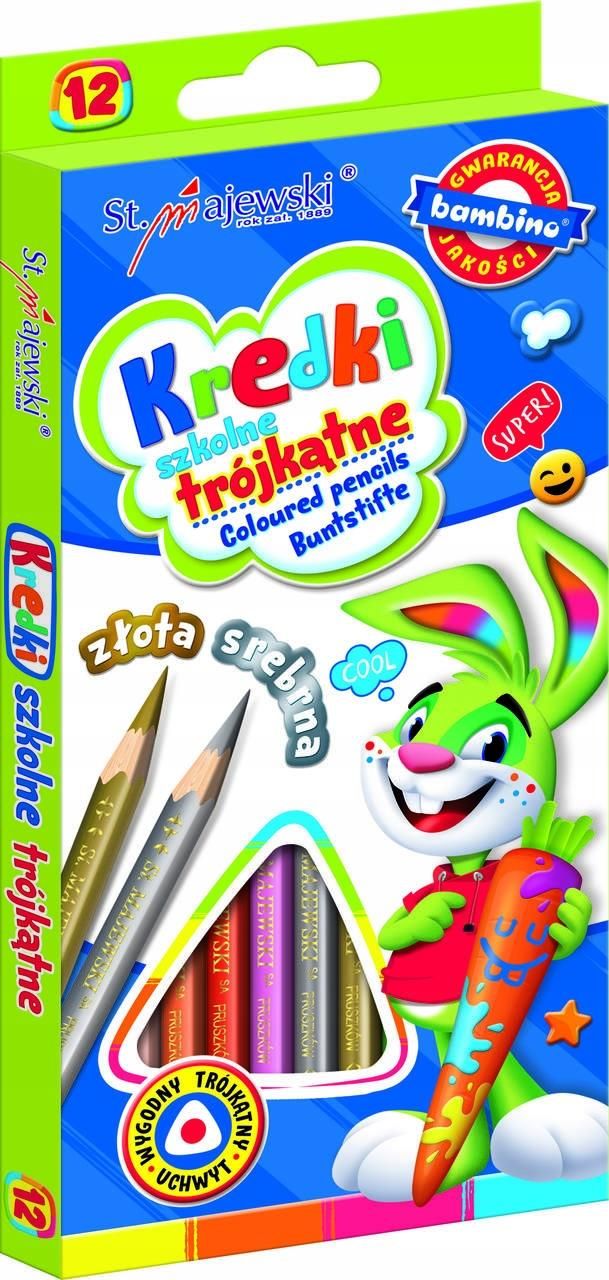 Kredki trójkątne Bambino 12 kolorów 9367ST-Majewski ➡️ Firma i usługi/Biuro i Reklama/Artykuły piśmiennicze ✔️ Ergonomiczne kredki o trójkątnym przekroju. Idealnie dopasowują się do małej dłoni dziecka. Szeroka gama kolorów, w tym kredki złote i srebrne. Kredki szkolne charakteryzują się wysoką …