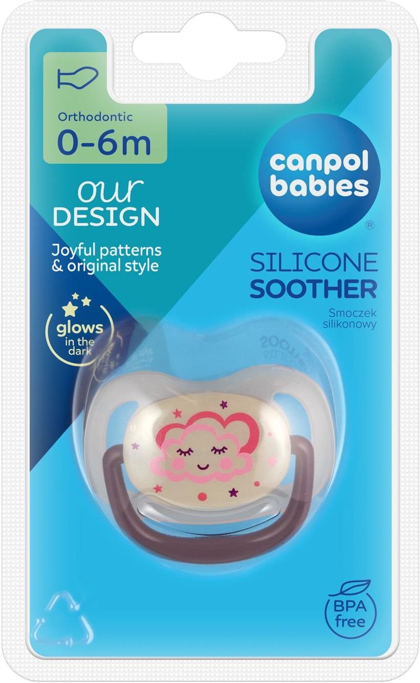 Smoczek uspokajający Canpol babies NIGHT DREAMS przeznaczony jest dla niemowląt od urodzenia do 6. miesiąca życia. Wykonany z najwyższej jakości, bezzapachowego i bezsmakowego silikonu, wspiera naturalną potrzebę ssania i zapewnia komfort dziecka. Wyposażony w anatomiczną gumkę oraz świecącą tarczkę, która ułatwia odnalezienie smoczka w ciemności. Symbol producenta: 22/500_pin