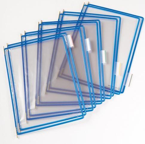 PANEL PREZENTACYJNY TARIFOLD A4 10 SZT. OTWARCIE Z GÓRY KOLOR NIEBIESKI: Komplet paneli prezentacyjnych Tarifold w rozmiarze A4 w kolorze niebieskim do nabiurkowych i naściennych systemów prezentacyjnych. Otwierane z góry. Panele wykonane są według opatentowanej francuskiej technologii, zapewniając niezrównany poziom jakości i wytrzymałości. Dodatkowo świadczy o tym gwarancja producenta, która wynosi aż 10 lat. Specjalny stalowy drut powoduje, że panele są bardzo elastyczne i zarazem odporne na wszelkiego rodzaju zgięcia. Kolorowa ramka ułatwia identyfikację i prezentację dokumentów. Matowy, antyodblaskowy materiał PVC 110 μ eliminuje refleksy świetlne, ułatwiając czytanie nawet przy bezpośrednio padającym świetle. Dostarczane są w opakowaniu po 10 sztuk wraz z 5 zakładkami indeksującymi umożliwiającymi organizację prezentowanych treści. 114001 TR
