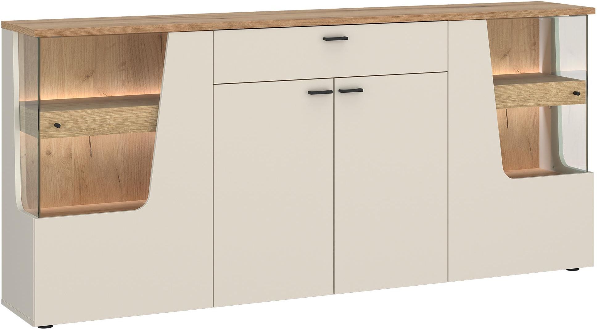 Komoda CUTOUT CTUK02 to propozycja dla osób, które cenią nowoczesny design w połączeniu z dużą funkcjonalnością. Jej bryła utrzymana w dekorze Dąb Coast Evoke z frontami w subtelnym odcieniu kaszmiru wprowadza do wnętrza ciepło i elegancję. Czarne, matowe uchwyty dodają całości wyrazistego, designerskiego akcentu, a geometryczna forma sprawia, że mebel doskonale komponuje się zarówno w aranżacjach skandynawskich, jak i minimalistycznych. Przemyślana konstrukcja i funkcjonalne wnętrze Komoda została zaprojektowana tak, aby zapewnić maksymalną ilość miejsca do przechowywania. Wyposażona jest w cztery pojemne szafki oraz praktyczną szufladę, które umożliwiają uporządkowanie zastawy stołowej, tekstyliów czy innych domowych akcesoriów. Boczne części mebla posiadają wstawki z hartowanego szkła, za którymi można wyeksponować dekoracje, a wbudowane oświetlenie LED podkreśla ich charakter i dodaje wnętrzu przytulnego klimatu. System cichego domykania zwiększa komfort codziennego użytkowania. Stylowy element do salonu lub jadalni Dzięki swojej szerokiej i eleganckiej formie CUTOUT CTUK02 sprawdzi się zarówno w przestronnym salonie, jak i w jadalni. To mebel, który łączy wysoką estetykę z praktycznymi rozwiązaniami, stając się centralnym punktem aranżacji. Doskonale prezentuje się samodzielnie, ale może też tworzyć spójną kompozycję z innymi elementami kolekcji CUTOUT. Wymiary Szerokość: 190 cm Głębokość: 40 cm Wysokość: 90 cm