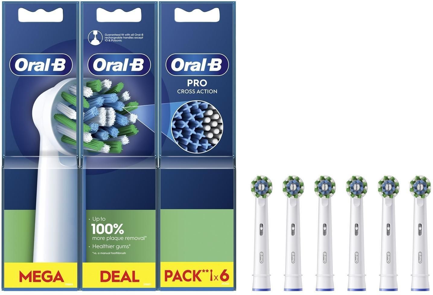 Oral-B Pro Cross Action White 6szt . CrossAction to jedna z najlepszych wymiennych końcówek do szczoteczek elektrycznych Oral-B, z włóknami ustawionymi pod kątem, aby usuwać nawet do 100% więcej płytki nazębnej w porównaniu ze zwykłą szczoteczką manualną. Kształt końcówki Oral-B CrossAction ze specjalnie zaprojektowanymi włóknami pozwala dokładnie otoczyć każdy ząb, a ich zaokrąglone końcówki chronią dziąsła. Te wyjątkowe włókna docierają głęboko do przestrzeni międzyzębowych, aby usuwać płytkę nazębną i pozostawiają całą jamę ustną czystszą niż w przypadku użycia zwykłej szczoteczki manualnej. Końcówka pasuje do wszystkich szczoteczek oscylacyjno-rotacyjnych. Firma Oral-B, założona w Kalifornii w roku 1950, od wielu lat dostarcza konsumentom, dentystom i sprzedawcom detalicznym na całym świecie znakomite produkty do pielęgnacji jamy ustnej. Natomiast po drugiej stronie Oceanu Atlantyckiego niemiecka firma Braun GmbH, która później połączyła siły z Oral-B, aby stworzyć akumulatorowe szczoteczki elektryczne do zębów, już ponad 80 lat temu zaczęła doskonalić swoje umiejętności, produkując najnowocześniejszy drobny sprzęt elektryczny Precyzyjne czyszczenie dzięki włóknom ustawionym pod kątem CrossAction to jedna z najbardziej zaawansowanych końcówek wymiennych do szczoteczek elektrycznych Oral-B, wyposażona w włókna ustawione pod kątem, które usuwają nawet do 100% więcej płytki nazębnej niż zwykła szczoteczka manualna. Model końcówki Oral-B CrossAction oparto na specjalnie zaprojektowanych włóknach ułożonych w taki sposób, by obejmowały jak największą powierzchnię zębów. Włókna sięgają głęboko między zęby, skutecznie usuwając płytkę nazębną i zapewniając uczucie świeżości oraz dokładniejsze mycie całej jamy ustnej niż w przypadku użycia zwykłej szczoteczki manualnej. Końcówka pasuje do wszystkich szczoteczek oscylacyjno-rotacyjnych Dokładnie czyści przestrzenie międzyzębowe Końcówka szczoteczki o kształcie inspirowanym profesjonalnym sprzętem dentystycznym dokładnie otacza każdy ząb i zapewnia precyzyjne czyszczenie, aby usunąć więcej płytki nazębnej niż w przypadku użycia zwykłej szczoteczki manualnej Regularnie wymieniaj końcówkę Dentyści zalecają wymianę końcówki szczoteczki co 3-4 miesiące. Wymienne końcówki szczoteczek Oral-B wyposażono w specjalne włókna sygnalizujące, kiedy należy wymienić końcówkę, aby zachować najwyższą skuteczność czyszczenia, w porównaniu ze szczoteczką manualną Wypróbuj 6 idealnych rozwiązań z tylko 1 szczoteczką Aby spełnić Twoje indywidualne potrzeby w zakresie pielęgnacji jamy ustnej, Oral-B oferuje szeroki wybór końcówek wymiennych do szczoteczek elektrycznych. Końcówki Oral-B pasują do wszystkich szczoteczek Oral-B, z wyjątkiem Pulsonic   Najczęściej zadawane pytania: Jak często należy wymieniać końcówkę szczoteczki? Dentyści zalecają wymianę końcówki szczoteczki co 3-4 miesiące lub częściej, kiedy włókna zużyją się lub stracą swój pierwotny kształt. Zużyte włókna tracą swoje właściwości, przez co zmniejsza się skuteczność czyszczenia Jaka jest różnica między modelem CrossAction i innymi końcówkami szczoteczek elektrycznych Oral-B? Każda końcówka szczoteczki Oral-B ma nieco inne właściwości i służy nieco innemu rodzajowi czyszczenia. Model CrossAction wyposażono w włókna ustawione pod kątem, które wyjątkowo skutecznie odrywają i usuwają płytkę nazębną oraz zapewniają znacznie lepsze efekty czyszczenia niż zwykła szczoteczka manualna. Końcówka Precision Clean pozwala uzyskać najwyższą precyzję czyszczenia i zwiększoną skuteczność w usuwaniu płytki nazębnej z linii dziąseł. Ten model działa też skuteczniej niż szczoteczka manualna. Włókna TriZone sięgają głęboko między zęby, skutecznie usuwają płytkę nazębną i umożliwiają mycie zębów w taki sposób, jak przy użyciu tradycyjnej szczoteczki manualnej. Końcówka Floss Action wyposażona jest w włókna MicroPulse, które sięgają głęboko między zęby, usuwając płytkę nazębną i zapewniając podobne efekty jak w przypadku stosowania nici dentystycznej (ale jej nie zastępują). Model 3D White wyposażono w nasadkę polerującą, która pomaga usuwać przebarwienia powierzchniowe. Końcówka Sensitive zapewnia delikatne, a jednocześnie bardzo skuteczne czyszczenie Do których szczoteczek pasuje końcówka CrossAction? Wymienna końcówka szczoteczki CrossAction pasuje do następujących szczoteczek: Oral-B Triumph, Oral-B SmartSeries, Oral-B PRO, Oral-B Vitality (z wyjątkiem Vitality Sonic) oraz Oral-B Pro-Health Power