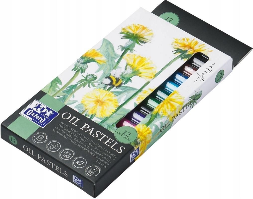 PASTELE OLEJNE OXFORD ARTISTIC 12 KOLORÓW Pastele olejne Oxford to bogate kolorystycznie narzędzia rysunkowe o miękkiej, maślanej konsystencji. Są doskonałe do mieszania kolorów i mogą być używane na wielu podłożach zarówno gładkich jak i chropowatych. Odpowiednie do papieru, tektury, podobrazi, tablic malarskich, szkła i wielu innych. Do uzyskania efektu rozmycia lub nadania połysku można użyć terpentyny lub innych właściwych mediów olejnych. Idealne do ilustracji, szablonów, wydrapywania, mieszania kolorów, kropkowania oraz impasto. Świetnie współgrają w przypadku użycia odpowiednich technik, takich jak „sgraffito”, polegającej na wydrapywaniu wg wzoru kolejnych warstw pasteli, w celu uzyskania zdobienia. Cechy główne Pastele olejne mają w swoim składzie dużą ilość spoiwa w postaci wosku i oleju, co pozwala miękko i gładko prowadzić je po podłożu Wysokiej jakości pigmenty sprawiają, że kolory są trwałe i intensywne Dzięki zastosowaniu oleju konsystencja kredek jest gładka i miękka, a to zapobiega ich kruszeniu Pastele są odporne na światło słoneczne, przez co namalowane prace pozostają wyraźne i intensywne w kolorze Konsystencja pasteli umożliwia łatwe i efektywne mieszanie kolorów oraz cieniowanie Pastele olejne umożliwiają otrzymanie różnego efektu intensywności koloru w zależności od siły nacisku Cechy dodatkowe Doskonałe do użytku amatorskiego i profesjonalnego Zapakowane w kartonowe pudełko otwierane od góry Kredki ułożone na czarnej, plastikowej tacce 12 kolorów