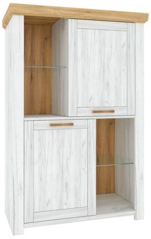 Design mebli z kolekcji SUDBURY stanowi bardzo udany pomost pomiędzy stylami nowoczesnym i klasycznym. Prostota we wzorze brył jest w bardzo udany sposób przełamana elementami dekoracyjnymi oraz kolorystyką, która łączy dąb caft biały ze złotym. Połączenie to sprawia, że kolekcja świetnie podkreśla jasne wnętrza, przy okazji wzbogacając je o ciepłe tony. Regał SUDBURY jest typem mebla, który doskonale oddaje urokliwą atmosferę salonu oraz jadalni. Pojemne wnętrze i półotwarty front sprawiają, doskonale nadaje się dla eksponowania książek oraz elementów dekoracyjnych, które dodają pomieszczeniu elegancji i smaku. Korpus oraz pełne półki regału SUDBURY zostały wykonane z płyty meblowej, wykończonej laminatem, jednak frontowa część mebla to płyta MDF ozdobiona folią PVC. WNĘTRZE Regał SUDBURY posiada otwarte i zamknięte półki, na których można umieścić książki oraz elementy zastawy stołowej lub artykuły dekoracyjne. Półki posiadają możliwość obciążenia do 10 kg. WYKOŃCZENIE Regał SUDBURY został wykończony w dwóch kolorach. Zewnętrzne elementy korpusu oraz półki są w kolorze dąb craft biały. Wewnętrznym częściom brył oraz blatom zostało nadane wybarwienie dąb craft złoty. Uroku kolekcji dodają również ładnie wkomponowane w bryłę uchwyty.