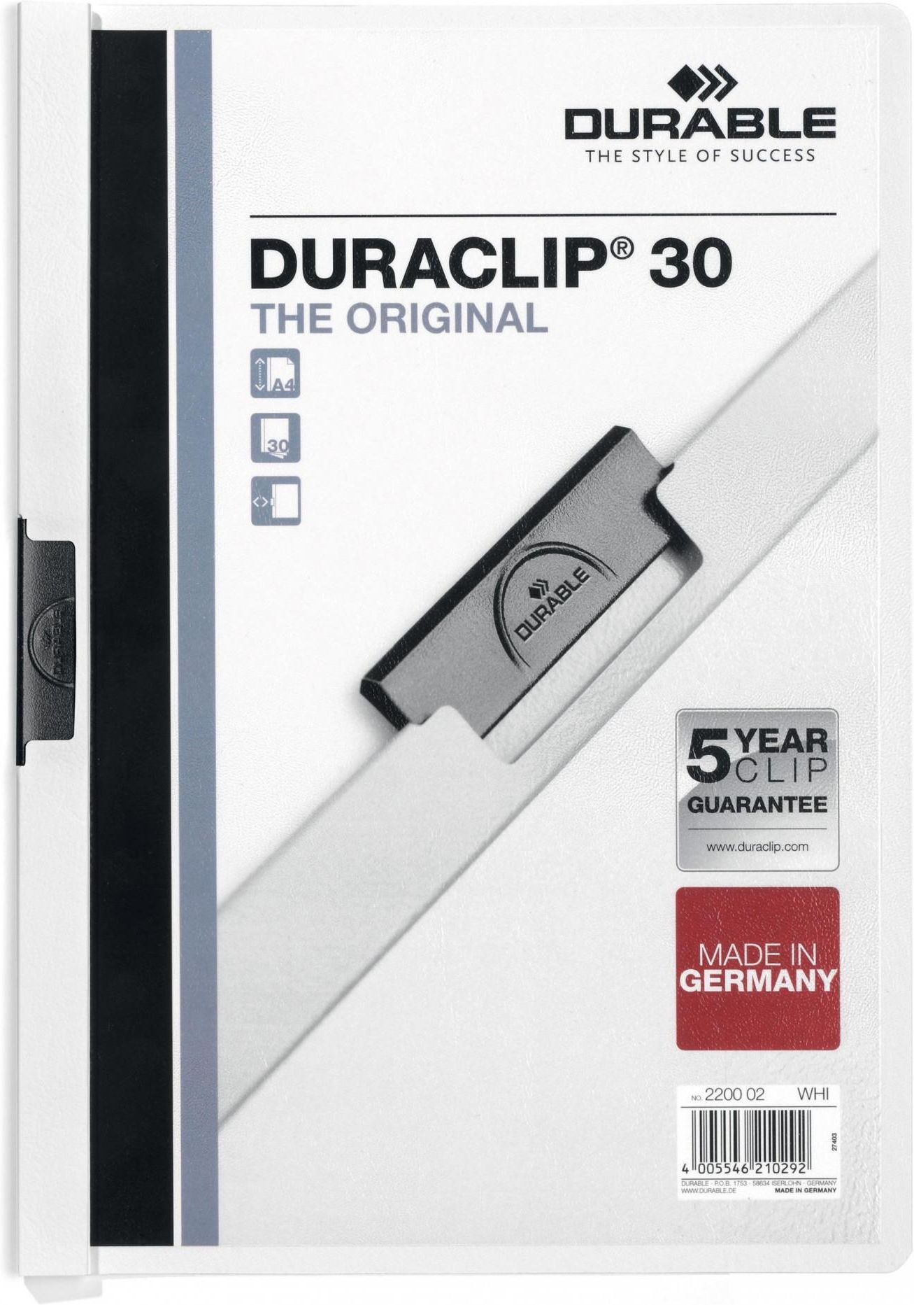 Skoroszyt zaciskowy formatu A4 z kolekcji Duraclip wykonany z trwałego PVC zacisk ze specjalnej stali posiada 5-letnią gwarancję przednia okładka jest transparentna, natomiast tylna biała mieści do 30 kartek zaletą zacisku jest to, że nie ma konieczności dziurkowania dokumentów skoroszyt jest doskonałym narzędziem pomocniczym dla prezentacji, materiałów szkoleniowych, opinii itp., a także dla porządkowania i przechowywania ofert, raportów i innych dokumentów kolor biały