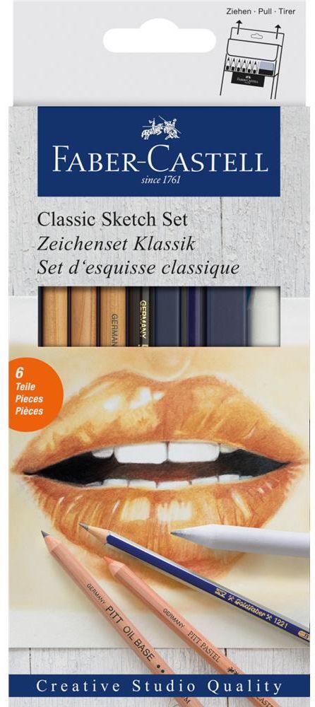 Zestaw do szkicowania Classic FABER-CASTELL. Zestaw startowy do rysowania dla hobbystów. Idealny do szkicowania i rysowania. Zawiera: 1 ołówek grafitowy Goldfaber 2B, 1 kredka olejowa Pitt czarna średnia, 1 kredka pastelowa Pitt biała średnia, 1 kredka pastelowa bezolejowa Pitt w kolorze sanguine, 1 kredka pastelowa bezolejowa Pitt w kolorze sepii, wiszer.