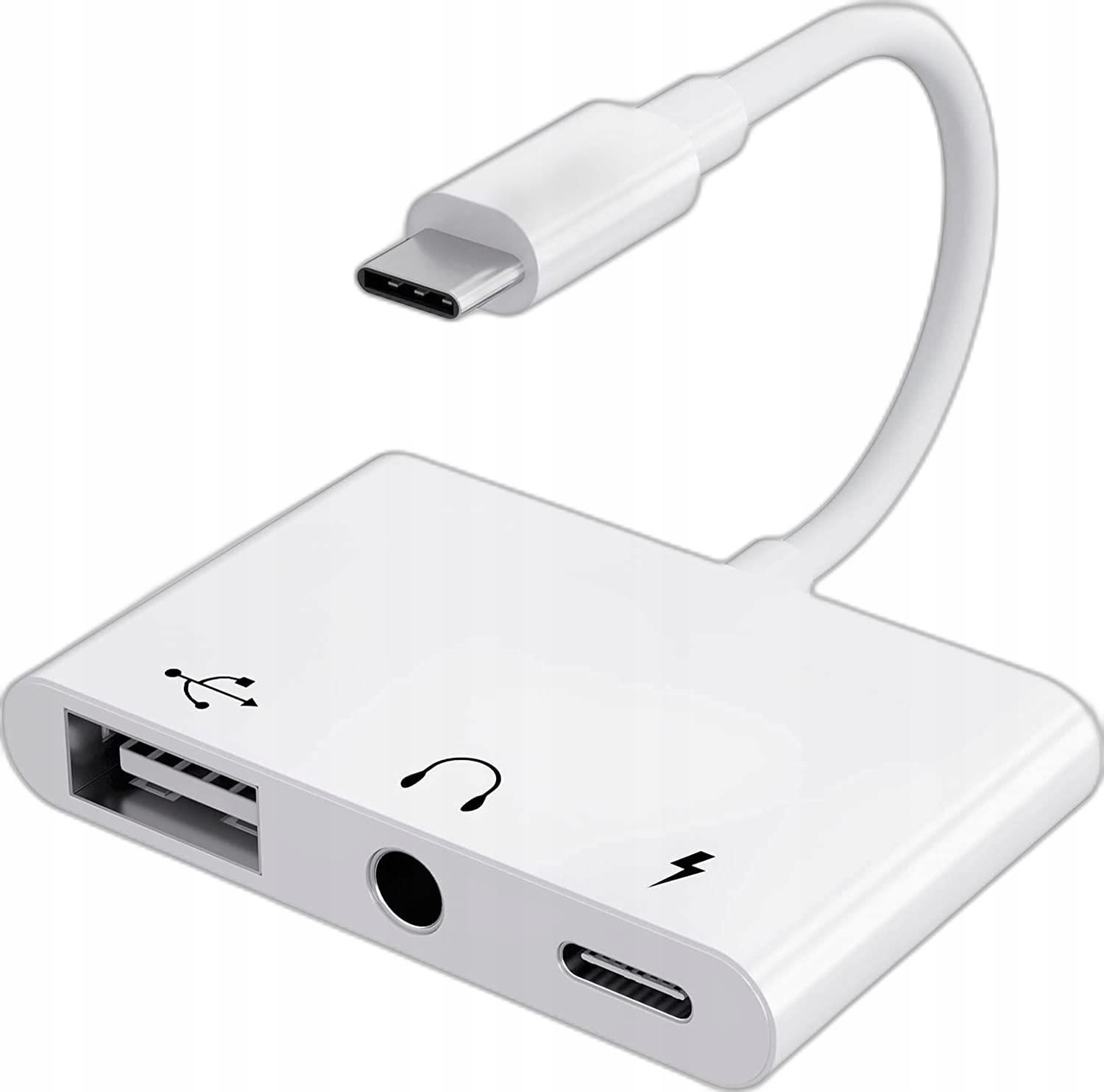 ADAPTER KABEL OTG Z USB C NA USB JACK ŁADOWANIE Kabel OTG to skrót od anglojęzycznego terminu "On-The-Go" i odnosi się do kabla, który umożliwia bezpośrednie połączenie dwóch i więcej urządzeń bez konieczności korzystania z komputera jako pośrednika. Tradycyjnie, kabel USB służył do łączenia urządzeń z komputerem, np. smartfonu z komputerem PC w celu przesyłania danych. Jednak kabel OTG rozszerza tę funkcjonalność, pozwalając na bezpośrednie połączenie większej ilości urządzeń USB, takich jak smartfon z pendrive'em, klawiaturą, myszą, czy nawet drukarką. Najważniejsze cechy produktu: Wtyk: USB-C - podłączamy do urządzenia Gniazdo 1: USB A 3.0 Gniazdo 2: JACK 3,5MM Gniazdo 3: USB-C ŻEŃSKIE (ZASILANIE) Produkt fabrycznie nowy Wykonany z wysokiej jakości materiałów Uniwersalny i prosty w obsłudze Kolor: BIAŁY Długość: 13 cm Zastosowanie: USB-C do USB-A 3.0: Ten adapter pozwala podłączyć urządzenia USB, takie jak klawiatura, mysz, pendrive lub aparat fotograficzny, do urządzeń wyposażonych w port USB-C USB-C do AUX (3,5 mm): Jeśli Twoje urządzenie nie ma wbudowanego gniazda słuchawkowego AUX (3,5 mm), adapter ten umożliwia podłączenie tradycyjnych słuchawek lub kabla audio z takim gniazdem. USB-C (GNIAZDO ZASILANIA): Adapter ten zapewnia również zasilanie, co pozwala na ładowanie urządzenia podczas korzystania z podłączonych akcesoriów.