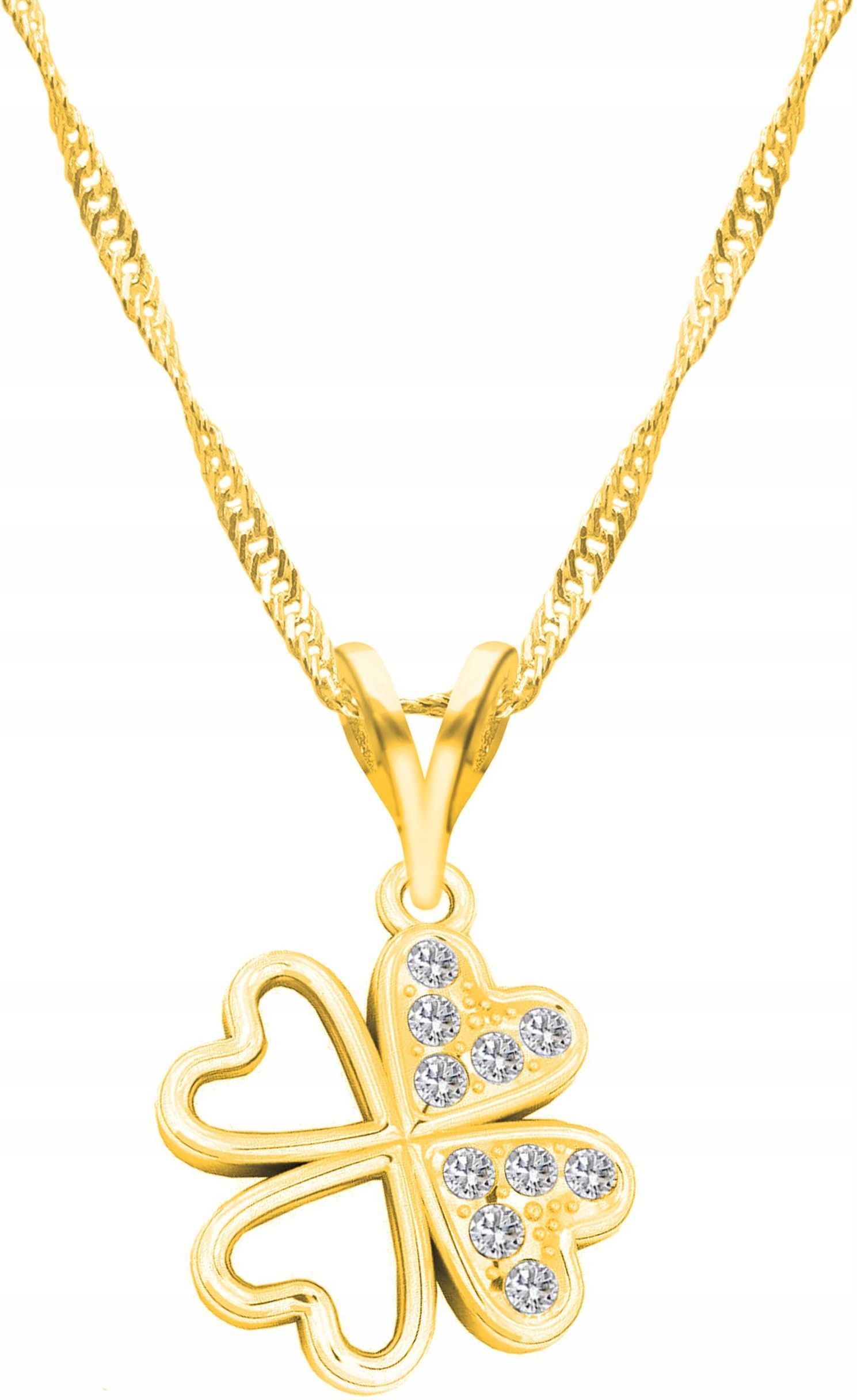 Naszyjnik złoty Koniczynka 💙 Surowiec: Srebro 💙 Próba: 925 💙 Powłoka:4-warstwy złota próby 999 (24 karaty) 💙 Kamień: Cyrkonia 💙 Typ: Naszyjnik 💙 Długość: 47cm + 3cm (przedłużka w kształcie serc) 💙 Splot łańcuszka: Singapur 💙 Motyw: Koniczynka 💎 Biżuteria pozłacana jest czterema warstwami …