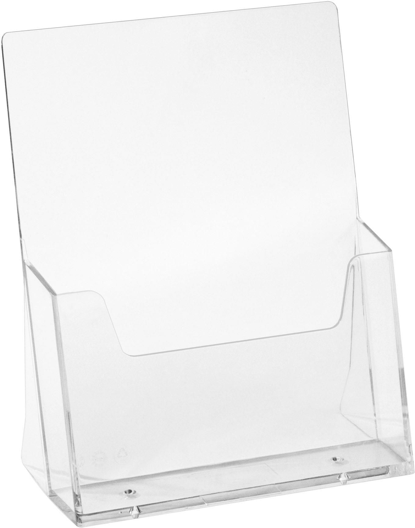 Odlewany plastikowy stojak umożliwiający prezentację ulotek w pozycji pionowej. Do postawienia na ladzie, biurku, stole. Dla formatu ulotek: A5 Długość: 83 mm Szerokość: 162 mm Wysokość: 198 mm Waga: 0,25 kg Głębokość kieszeni: 32mm Mocniejsza konstrukcja niż w przypadku standardowych giętych stojaków plexi, dzięki technice odlewania.