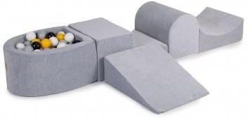 The MeowBaby Foam play set with ball pit and 100 balls Fun has a great dimension! Now you can create your own playground at home! Our recreational blocks not only boost children's imagination, but also teach creative thinking. The five-element set of modules can be used for playing, as well as for exercises, to create obstacle courses or spatial constructions. Particular elements may serve as poufes or seats. Antiallergic polyurethan foam which was used for the production of the set is characterised with small weight and high resistance to the deformations, due to which the product is safe for the child and exceptionally practical at the same time. Particular blocks are characterised with lightness therefore are easy to be placed in other places. All elements of the set have the removable cover, which facilitates washing in washing machine and maintaining the obstacle course in clean and tidy condition. The mini ball pit attached to the set is filled with colorful balls, which you can select from a wide range of colours by your preferences. The foam play set is a perfect part of equipment for the nursery, playing grounds, but, first of all, due to the cover extreemly pleasant to touch– also for children rooms. The simple and minimalistic desgin of this product makes it perfectly fit into the home space. The product is intended for the children aged 1-3, exceptionally for the use under care of an adult. Foam play set – specification: The set consists of 5 elements including the mini ball pit with the set of 100 balls Filling: polyurethan foam Case: textile soft in touch (77% cotton 23% polyester), with the zip-fastener, The case can be washed in the washing machine in the temperature of 30°C Dimensions: The width of each single module: 45 cm The height of the highest module: 35 cm The length of the whole construction: 197 cm + 60 cm chock set additionally in any place Dimensions of the mini ball pit: 57 cm x 45 cm x 30 cm