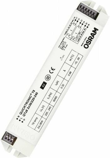 Statecznik Elektroniczny QUICKTRONIC QTz8 4X18 OSRAM Statecznik Elektroniczny QUICKTRONIC QUICKTRONIC QTz8 renomowanej i cenionej firmy OSRAM to nowoczesny układ zapłonowy do świetlówek liniowych T8/Æ o średnicy 26 mm. Statecznik o kompaktowej obudowie charakteryzuje się automatycznym restartem po wymianie lampy. Stateczniki OSRAM zastępują tradycyjny układ - statecznik magnetyczny + starter. Zapewniają oszczędność energii oraz pewny start. KORZYŚCI ZE STOSOWANIA PRODUKTU Kompaktowa obudowa Automatyczny restart po wymianie lampy CECHY PRODUKTU Napięcie zasilania: 220…240 V Napięcie sieciowe: 198…264 V Częstotliwość linii: 50 Hz | 60 Hz Wskaźnik sprawności energetycznej EEI: A2 SPECYFIKACJA TECHNICZNA Producent OSRAM Model QTz8 4X18 Moc 4x 18W Napięcie Wejściowe 220-240V Temperatura Pracy -15°C ~ +50°C Stopień ochrony IP20 Trwałość 30000h Wymiary: Długość 210,0 mm; Szerokość 40,0 mm; Wysokość 30,0 mm; Odległość otworów montażowych, długość 200,0 mm; Masa produktu 150,00 g GALERIA Symbol produktu: OSRSTA0030 Produkt wykonany został z wysokiej jakości materiałów, zapewniających jego długotrwałą żywotność i satysfakcję z zakupu. Kupując u nas otrzymujesz nowy, oryginalnie zapakowany produkt. Tylko zakup markowych produktów gwarantuje wysoką jakość, energooszczędność, bezpieczeństwo użytkowania oraz pewność, że informacje umieszczone na opakowaniach będą zgodne z prawdą.