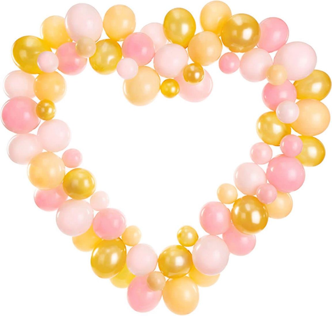Girlanda balonowa ze stelażem Serce różowe. Wymiary po złożeniu ok 166 x 160 cm. Zestaw zawiera: - 68 balonów lateksowych (17 szt. w kolorze Pastel Pale Pink, 17 szt. w kolorze Pastel Baby Pink, 17 szt. w kolorze Pastel Light Peach, 17 szt. w kolorze Metallic Gold). -16 kartonowych elementów. - 20 szt. naklejek dwustronnych. Łącznie zestaw zawiera 104 elementy.