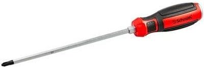 Wkrętak krzyżowy marki Schmith zakończony metalową skuwką do podbijania. Trzon przechodzący przez rękojeść zakończony zabierakiem do wspomagania kluczem.