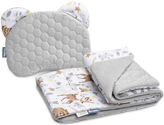 KOMPLET DO WÓZKA VELVET BIAŁY LEŚNA PRZYGODA W skład kompletu wchodzi śliczna poduszka z uszami misia oraz kołderka z delikatnym wypełnieniem włókniną silikonową. Dwustronny komplet jest wykonany z wysokiej jakości materiałów – kolorowej bawełny oraz bardzo przyjemnej tkaniny velvet, która utuli każdego bobasa. Komplet idealnie sprawdza się w wózku, łóżeczku, kołysce czy jako mata dla maluszka. Sama poduszka może służyć jako przytulanka. Wysoką jakość wykonania podkreśla estetyczna wypustka Najważniejsze cechy Komplet idealny do gondoli, sprawdzi się również w domu Wykonany z najwyższej jakości tkaniny velvet oraz 100% bawełny Wymiary poduszki: 36x28 cm (+/- 2cm) Wymiary kocyka: 56x76 cm (+/- 2cm) Wypełnienie stanowi warstwa antyalergicznej włókniny silikonowej Produkt polski Skład Poszewka: 100% bawełna/100% poliester Wkład: 100% poliester Sposób konserwacji Prać ręcznie w temp. max. 30 stopni Nie wybielać Nie czyścić chemicznie Można suszyć w suszarce, w niskiej temperaturze Prasować tylko po stronie bawełny, przy temp. maks. 110 stopni W skład kompletu wchodzi śliczna poduszka z uszami misia oraz kołderka z delikatnym wypełnieniem włókniną silikonową. Dwustronny komplet jest wykonany z wysokiej jakości materiałów – kolorowej bawełny oraz bardzo przyjemnej tkaniny velvet, która utuli każdego bobasa. Komplet idealnie sprawdza się w wózku, łóżeczku, kołysce czy jako mata dla maluszka. Sama poduszka może służyć jako przytulanka. Wysoką jakość wykonania podkreśla estetyczna wypustka Najważniejsze cechy: • Komplet idealny do gondoli, sprawdzi się również w domu • Wykonany z najwyższej jakości tkaniny velvet oraz 100% bawełny • Wymiary poduszki: 36x28 cm (+/- 2cm) • Wymiary kocyka: 56x76 cm (+/- 2cm) • Wypełnienie stanowi warstwa antyalergicznej włókniny silikonowej • Produkt polski Skład: • Poszewka: 100% bawełna/100% poliester • Wkład: 100% poliester Sposób konserwacji: • Prać ręcznie w temp. max. 30 stopni • Nie wybielać • Nie czyścić chemicznie • Można suszyć w suszarce, w niskiej temperaturze • Prasować tylko po stronie bawełny, przy temp. maks. 110 stopni 38.95