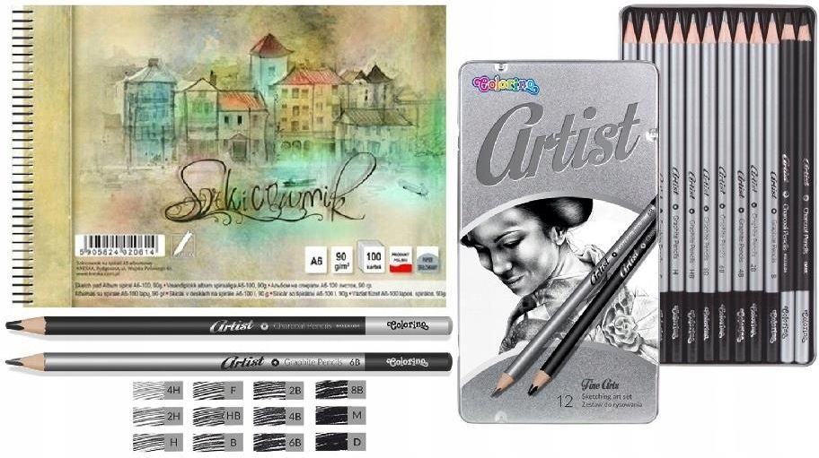 Szkicownik A6 KRESKA plus zestaw do rysowania Zestaw do szkicowania A6 Zestaw do rysowania Colorino Artist 12 sztuk: ołówki i węgle okrągłe w oprawie drewnianej 12 sztuk w metalowym pudełku przeznaczone do rysowania, projektowania i szkicowania łatwe w temperowaniu idealnie dopasowują się do dłoni …