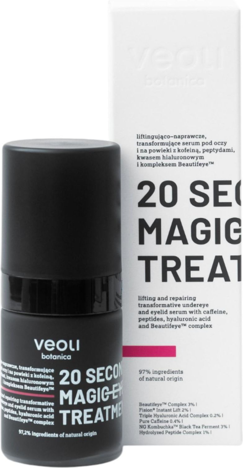20 Seconds Magic Eye Treatment - Transformujące serum liftingująco-naprawcze pod oczy i na powieki20 Seconds Magic Eye Treatment to innowacyjne serum zaprojektowane, aby kompleksowo pielęgnować delikatną skórę wokół oczu. Jego transformująca formuła, przechodząca z lekkiej konsystencji wodnej w okluzyjną, skutecznie zatrzymuje substancje aktywne w głębszych warstwach skóry, zapewniając intensywne działanie liftingujące, naprawcze oraz nawilżające. Produkt zawiera 97% składników pochodzenia natur