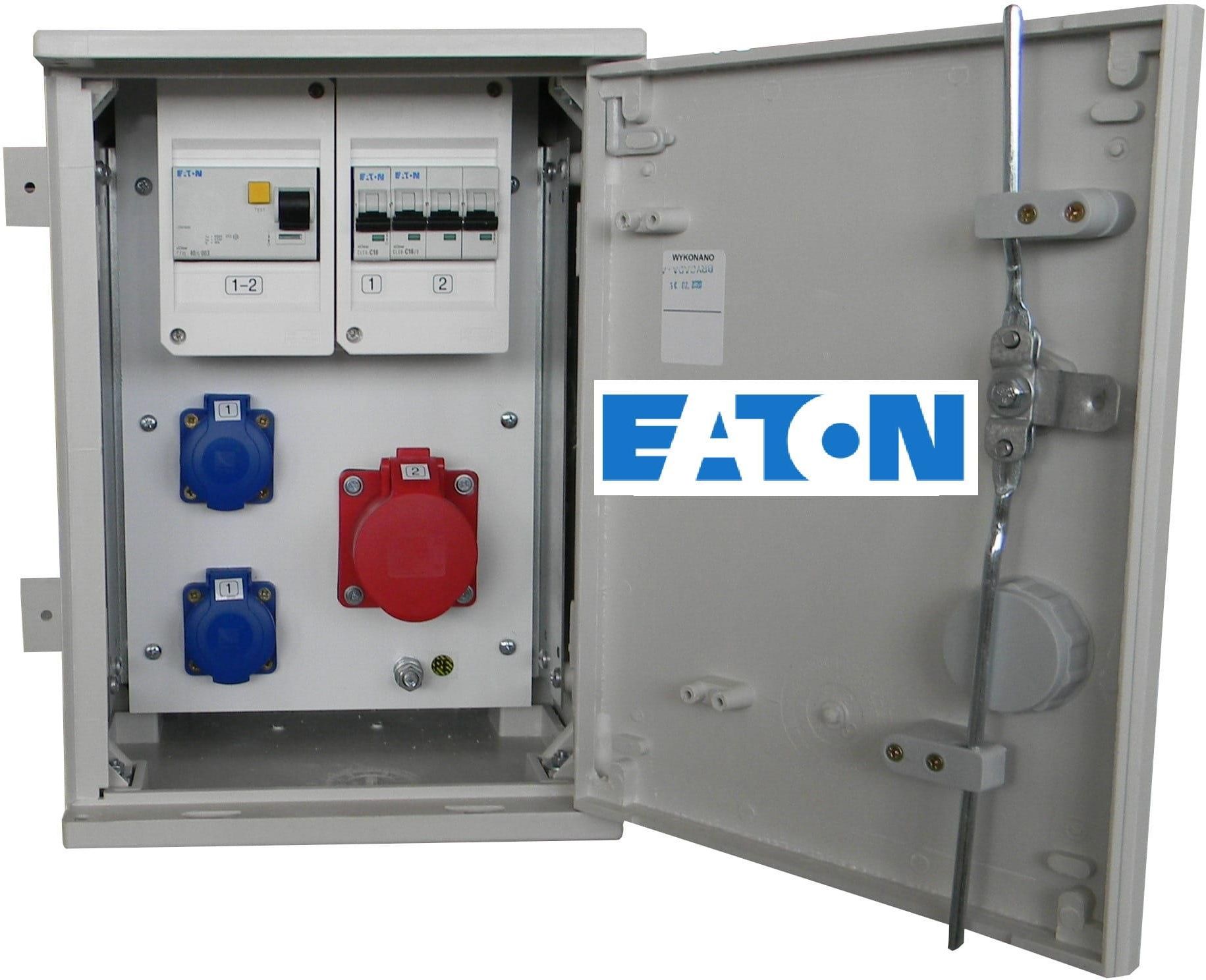 Wyposażenie: Podłączenie: Kabel max. 5x25mm2 Opis: Rozdzielnica budowlana przeznaczona do zasilania np. budowy lub działki kempingowej. Rozdzielnica wykonana jest na bazie obudowy z poliestru termoutwardzalnego, który posiada najlepsze właściwości elektryczne i mechaniczne. Dzięki wysokiej odporności na promieniowanie UV nie jest wrażliwa na długotrwałe działanie promieni słonecznych tak jak PVC lub ABS. Wysoka jakość obudowy oraz wykonania sprawia, że rozdzielnica wytrzyma cały okres budowy a następnie może posłużyć np. jako punkt zasilania urządzeń elektrycznych służących do pielęgnacji ogrodu. Parametry techniczne: wymiary: szer. x wys. gł. 260x402x250 (mm), daszek skośny, uchwyty do montażu rozdzielnicy na elewacji, 2 x gniazdo jednofazowe 3P 16A/230V, 1 x gniazdo trójfazowe 5P 16A/400V, 1 x wyłącznik różnicowoprądowy 40A/30mA AC EATON MOELLER typ HNC-40/4/003 1 x wyłącznik nadmiarowoprądowy 1P C16A EATON MOELLER typ HN-C16/1, 1 x wyłącznik nadmiarowoprądowy 3P C16A EATON MOELLER typ HN-C16/3, drzwi rozdzielnicy zamykane za pomocą zamka i klucza, klamka rozdzielnicy dodatkowo przystosowana do zamykania za pomocą kłódki, dławik dla przewodu zasilającego PG21, rozdzielnica dedykowana do sieci: TN-C, TN-S