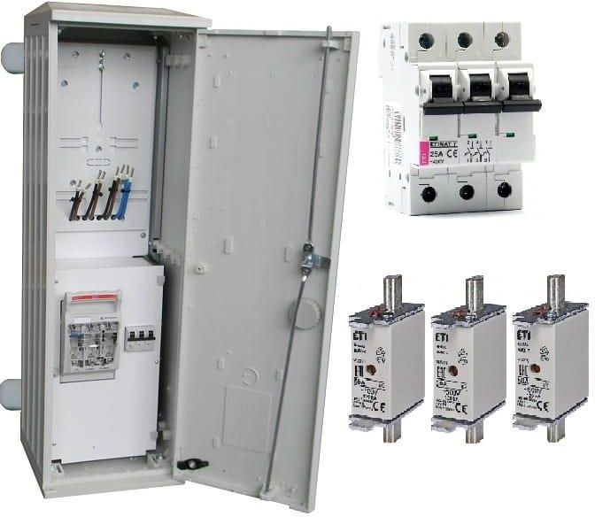 Rozdzielnica licznikowa to złącze pomiarowe służące do rozliczeń poborów energii elektrycznej z Zakładem Energetycznym. Prezentowana rozdzielnica dedykowana jest do przyłącza 3 fazowego. Rozdzielnica wykonana jest na bazie obudowy z poliestru termoutwardzalnego, który posiada najlepsze właściwości elektryczne i mechaniczne. Dzięki wysokiej odporności na promieniowanie UV nie jest wrażliwa na długotrwałe działanie promieni słonecznych tak jak PVC lub ABS. Rozdzielnica przystosowana do montażu 3F trójfazowego licznika energii elektrycznej zgodnie z wymogami Zakładu Energetycznego TAURON Parametry techniczne: wymiary: szer. x wys. gł. 260x883x250 (mm), daszek skośny, uchwyty do montażu rozdzielnicy na elewacji, aparatura przedlicznikowa w obudowie przystosowanej do plombowania, 1 x Zabezpieczenie przedlicznikowe: rozłącznik bezpiecznikowy RBK00-160A z wkładkami 3x50A, 1 x Tablica licznikowa do zabudowy licznika energii elektrycznej, 1 x Ogranicznik mocy ETIMAT 3P 25A, klamka rozdzielnicy przystosowana do wkładki typu masterkey lub zamykania za pomocą kłódki, dławik dla przewodu zasilającego PG29, dławik dla przewodu odpływowego PG29, dławik dla przewodu uziemiającego PG16, Rozdzielnia wyposażona jest w zacisk PEN 2x50mm2 na którym następuje rozdział przewodu PEN na PE i N z możliwością podłączenia przewodu uziemiającego, komplet okablowania przewodem LGY 16mm2, rozdzielnica dedykowana do sieci: TN-C, TN-S PONIŻEJ DOKUMENTACJA DO POBRANIA: