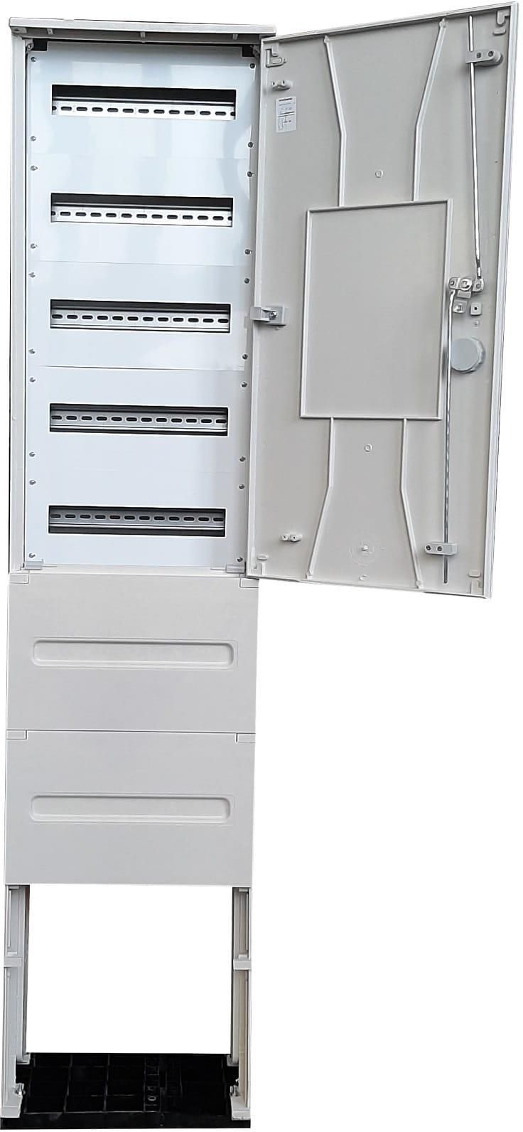 ROZDZIELNIA SKRZYNKA ELEKTRYCZNA NA FUNDAMENCIE DO WKOPANIA W ZIEMIĘ POD ZABUDOWĘ ELEKTRYCZNEJ APARATURY MODUŁOWEJ. TYP: OZ 40x80+F+5x16MOD Parametry techniczne: Rozdzielnica wyposażona w stelaż oraz maskownice umożliwiające montaż 5 rzędów aparatury modułowej w każdym rzędzie po 16 MOD = 5x16MOD Wymiary (mm) : szerokość/wysokość/głębokość : 400/ 1773/ 250 Klasa ochronności: II Stopień ochrony IP44, IK10 Materiał: poliester termoutwardzany zbrojony włóknem szklanym, Odporność na warunki atmosferyczne, Kolor: szary RAL 7035 Obudowy poliestrowe przeznaczone są do wykonywania rozdzielnic elektrycznych zasilających instalacje elektryczne w: budownictwie mieszkaniowym, zakładach produkcyjnych, przemyśle, energetyce zawodowej itp Drzwi rozdzielnicy wyposażone są w 3 punktowe metalowe zamknięcie z metalowymi cięgłami. Klamka rozdzielnicy przystosowana jest do montażu wkładki na zamek patentowy oraz wyposażona jest w metalowe ucho dla dodatkowego zabezpieczenia za pomocą kłódki. Wkładka do klamki na naszej innej aukcji