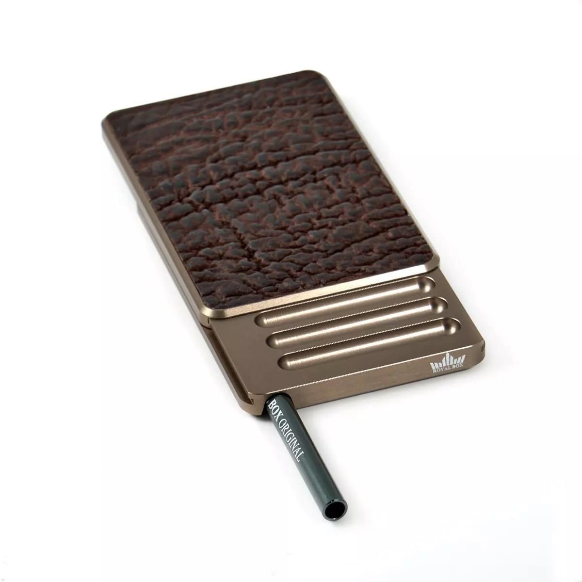 Royal Box Snuff Box - Tabakiera Exclusive wzór SHARK BROWN Unikalny dozownik tabaki Royal Box Snuff Box wykończony autentyczną skórą rekina. Wykonany z gładkiego, szczotkowanego aluminium. Zaopatrzony w wysuwaną szufladkę z 8 podziałkami do dozowania tabaki/proszków. W zestawie: 2 aluminiowe rurki …