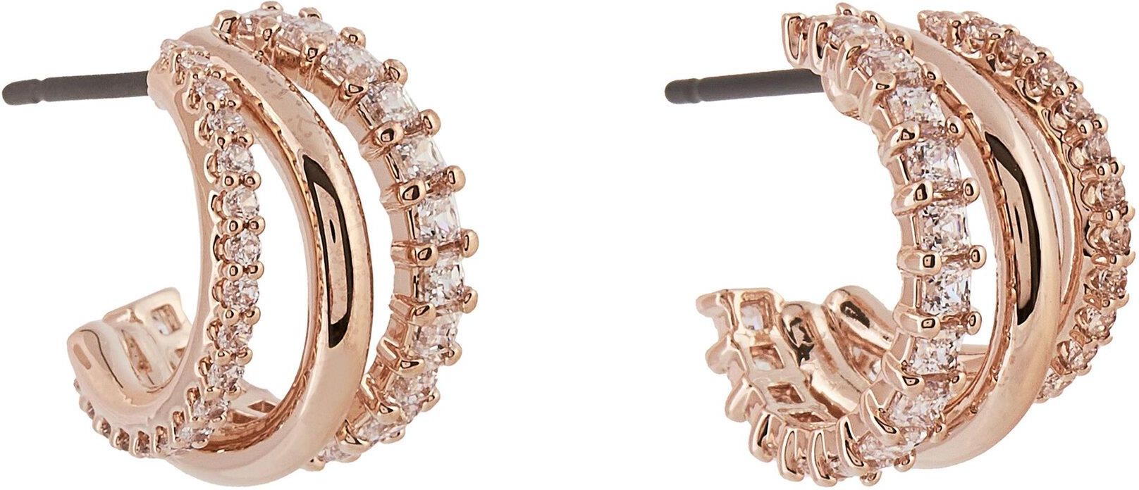 Misternie wykonane kolczyki hyperbola to przykład optymalnego wyglądu Każdy kolczyk składa się z trzech małych obręczy z powłoką w odcieniu różowego złota ozdobionych cyrkoniami swarovskiego w szlifie okrągłym i kwadratowym w oprawie szatonowej Uzupełnienie stylizacji o pasującą bransoletkę typu bangle lub naszyjnik zapewni wygląd przyciągający spojrzenia