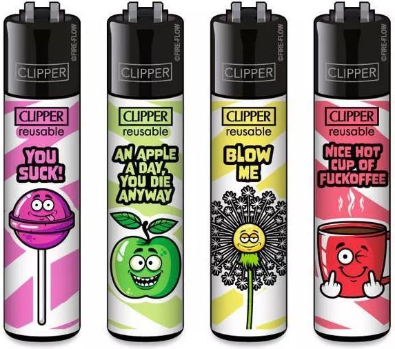 Zapalniczka Clipper wzór YOU SUCK Zapalniczka Clipper Classic w zabawnym wzorze You Suck - 4 motywy do wyboru. Clippery posiadają wymienny krzemień oraz wyjmowany ubijak - wystarczy że pociągniesz iskrownik w górę. 1 ładowanie gazem umożliwia 3000 uruchomień.