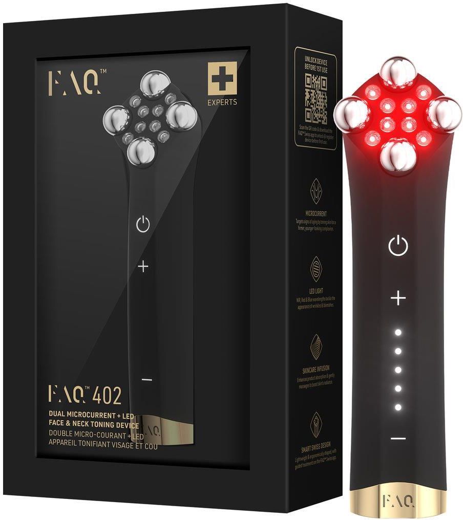 KIEDY NAUKA SPOTYKA SIĘ ZE SKÓRĄ FAQ™ 402 to najlepsze rozwiązanie przeciwstarzeniowe przeciw utracie elastyczności, głębokim zmarszczkom, drobnym liniom i plamom starczym na twarzy i szyi. Innowacyjne połączenie podwójnego mikroprądu, elektroporacji i masażu T-Sonic™ - uzupełnione trzema długościami fal światła LED - stymuluje produkcję kolagenu i zwalcza oznaki starzenia w najgłębszych warstwach skóry. Rezultat? Wyraźnie gładsza i jędrniejsza skóra. Testowane klinicznie: - Widocznie mniej głębokich zmarszczek w ciągu 1 tygodnia. - Zauważalnie jędrniejsza i bardziej elastyczna skóra w ciągu 1 tygodnia. - Lepsze wchłanianie składników aktywnych. Dzięki podwójnemu mikroprądowi, który przewodzi energię poziomo i pionowo, tworzona jest dynamiczna sieć energetyczna dla maksymalnego efektu. ZALETY - Podnosi i podkreśla kości policzkowe, linię żuchwy i podbródek - Ujędrnia i napina skórę, nadając jej gładszy, młodzieńczy wygląd - Poprawia koloryt i teksturę skóry, redukuje zaczerwienienia i plamy starcze - Nawilża dzięki lepszemu wchłanianiu składników aktywnych - Zmniejsza opuchliznę i nadaje skórze więcej blasku - Dostosowuje zabieg za pomocą mikroprądów sterowanych sztuczną inteligencją w celu uzyskania optymalnych rezultatów SPECYFIKACJA - Podwójny mikroprąd z poziomym i pionowym ruchem energii dla dynamicznej sieci energetycznej - 4 tryby mikroprądów: Advanced™, Tapping™, Lifting™ i Sculpting™ Microcurrent™ - Terapia NIR, czerwonymi i niebieskimi diodami LED do stymulacji kolagenu, redukcji zmarszczek, plam pigmentacyjnych i nierównej tekstury skóry. - Elektroporacja poprawiająca nawilżenie, elastyczność i wchłanianie składników aktywnych przez skórę - Masaż T-Sonic™ wspomagający drenaż limfatyczny i dodający skórze blasku - Zabiegi prowadzone przez sztuczną inteligencję za pośrednictwem aplikacji FAQ - Możliwość ładowania przez USB-C do 240 minut na jednym ładowaniu - 100% wodoodporny i wykonany z odpornego na bakterie silikonu - Bezprzewodowy i łatwy do czyszczenia - Wolne od okrucieństwa i wegańskie - Bezpieczny i skuteczny dla wszystkich rodzajów skóry - Dożywotni brak konieczności wymiany części - 2 lata ograniczonej gwarancji ZAKRES DOSTAWY - FAQ™ 402 - Kabel USB do ładowania - Skrócona instrukcja obsługi - Instrukcja obsługi