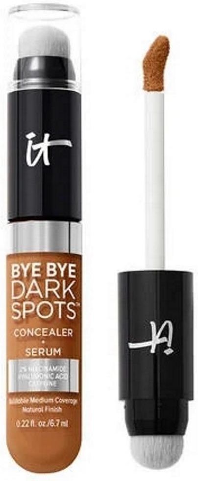 Powiedz bye bye przebarwieniom, cieniom pod oczami i nierównej teksturze skóry dzięki Bye Bye Dark Spots Concealer + Serum. Korektor o średnim stopniu krycia od IT Cosmetics jest niezwykle bogaty ze względu na zawartość naszego wyjątkowego serum Super Bright Serum z 2% niacynamidem, kwasu hialuronowego i kofeiny. Produkt zapewnia natychmiastowe krycie i widoczną poprawę stanu skóry z każdym kolejnym dniem stosowania. Używaj go na całej skórze lub punktowo tylko tam, gdzie potrzebujesz. Opracowany we współpracy z dermatologami i chirurgami plastycznymi, został przetestowany klinicznie pod względem zmniejszania widoczności przebarwień i cieni pod oczami.* Dodatkowo jego zniezwykle lekka konsystencja zapewnienia 24-godzinne nawilżenia. Jeśli pragniesz naturalnego wykończenia (nawet w podróży), nakładaj produkt pod lub na makijaż za pomocą podwójnego aplikatora i pędzelka do korektora kabuki. Opracowane w oparciu o wiedzę chirurgów plastycznych i dermatologów w zakresie składników i pielęgnacji skóry, IT Cosmetics tworzy rewolucyjne rozwiązania i kochające skórę formuły, które zapewniają widoczne rezultaty. KLUCZOWE ZALETY - Korektor + serum skutecznie niwelują przebarwienia oraz wygładzają strukturę cery, jednocześnie kryjąc wszelkie niedoskonałości. - Przebadany klinicznie pod kątem zmniejszenia widoczności przebarwień, cieni pod oczami, drobnych zmarszczek i tekstury skóry* oraz zapewnienia 24-godzinnego nawilżenia. - Możliwość budowania pożądanego krycia. Średnie krycie i lekka płynna konsystencja nadadzą dodatkowo naturalnego wykończenia. - Produkt wielozadaniowy idealny do stosowania na całą twarz lub jako korektor punktowy. - Wzbogacony o Super Bright Serum z 2% niacynamidem, kwasem hialuronowym i kofeiną. Korzyści dla skóry: - Odpowiedni dla wszystkich rodzajów skóry - Odpowiedni dla skóry wrażliwej -Testowany dermatologicznie - Formuła wegańska** - Formuła bez perfum KLUCZOWE SKŁADNIKI: Zawiera: - 2% Niacynamid: Pomaga wyrównać strukturę i koloryt skóry, minimalizuje przebarwienia. - Kwas hialuronowy: Wspomaga elastyczność i jędrność skóry. - Kofeina: Nadaje skórze promienisty blask. *W 12-tygodniowym badaniu klinicznym. **Formuła wegańska: nie zawiera składników pochodzenia zwierzęcego. Aby ukryć przebarwienia, wybierz odcień, który najlepiej pasuje do odcienia skóry w miejscach, które chcesz ukryć. Aby rozświetlić pożądane punkty na twarzy lub pod oczami, wybierz kolor od jednego do dwóch odcieni jaśniejszy. Sposób użycia: Nakładaj korektor na całą twarz, wszędzie tam, gdzie czujesz, że Twoja skóra potrzebuje małego wsparcia. 1. Za pomocą aplikatora nałóż produkt bezpośrednio w wybrane miejsca, które chcesz ukryć lub rozjaśnić. 2. Za pomocą wbudowanego pędzelka delikatnie rozblenduj korektor, by wtopił się w skórę. 3. Stosuj w parze z podkładem Your Skin But Better CC+ Nude Glow with SPF 40, by uzyskać efekt zdrowego blasku. 1 szt.