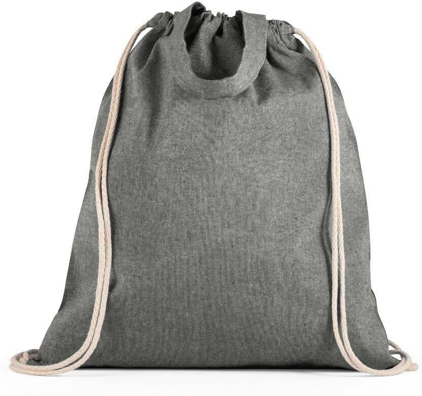 Worek zawierający bawełnę z recyklingu (70%) i poliester z recyklingu (30%) (140 g/m²), z 30 cm uchwytami i bawełnianymi sznurkami do zamykania. 370 x 410 mm