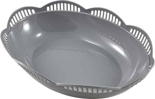 Opis koszyka: wykonany z połyskującego tworzywa sztucznego, jest lekki, owalny kształt koszyka stwarza więcej możliwości jego wykorzystania, ażurowe wykończenie u góry dodaje mu lekkości, plastikowa konstrukcja koszyka ułatwia jego mycie, jest łatwy do utrzymania w czystości, sprawdzi się jako koszyk na owoce, warzywa do spiżarni, po wyłożeniu wnętrza ściereczką lub serwetką może służyć jako koszyk na chleb, bułki i inne pieczywo, w przeciwieństwie do koszyków metalowych jest odporny na wilgoć, może służyć jako półmisek do rozmrażania, kuweta do płukania owoców, warzyw lub pojemnik na drobiazgi, gdyż nie posiada otworów jak np. koszyki wiklinowe, dostępny w atrakcyjnych kolorach: różowym, beżowym, szarym, turkusowym. Wymiary: Długość - 33 cm Szerokość - 23 cm Wysokość - 8,5 cm