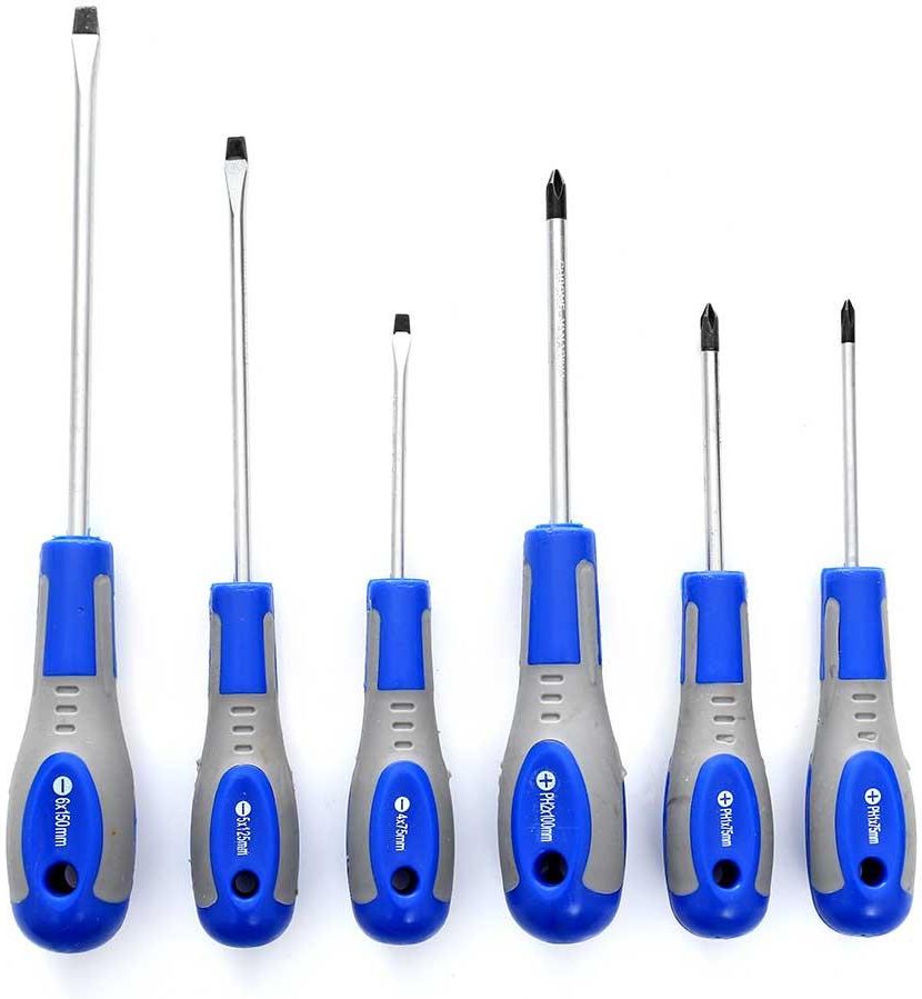 Zestaw 6 śrubokrętów wkrętaki z magnesowymi końcówkami Zestaw wkrętaków został wykonany z wysokiej jakości materiałów w tym ze stali chromowo wanadowej groty posiadają satynowe wykończenie, zabezpieczające przed korozją, ponadto końcówki grotów są dodatkowo piaskowane i namagnesowane co umożliwia pewny chwyt łba śruby. Rączka została wykonana z tworzywa sztucznego i pokryta gumową powłoką, która gwarantuje pewne trzymane w dłoni. Skład zestawu Wkrętaki płaskie: 4x75mm ; 5x125mm ; 6x150mm Wkrętaki krzyżak: PH1(4mm)x75mm ; PH1(5mm)x75mm ; PH2(6mm)x100mm