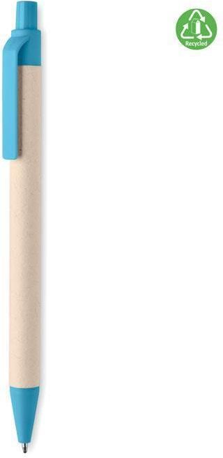 Długopis z kartonu po mleku Stan: Nowy Wymiary (cm): Ø0,9 x 13,9 cm Waga (kg): 0.007 Kolory: niebiesky Przyciskany długopis z korpusem wykonanym z kartonów po mleku pochodzących z recyklingu i z elementami z PLA (w 100% biodegradowalnej kukurydzy). Niebieski tusz.