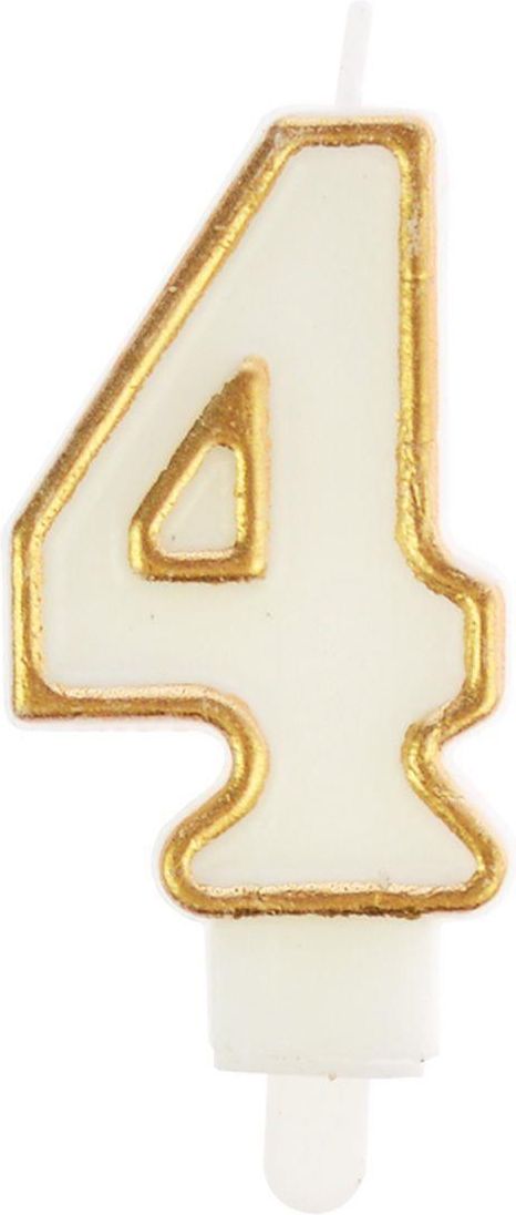 Świeczka cyferka nr 4 biała ze złotą obwódką Świeczka urodzinowa w kształcie cyferki ze złotą obwódką na blistrze. Wysokość świeczki 7,5cm. AUKCJA DOTYCZY JEDNEJ SZTUKI ŚWIECZKI