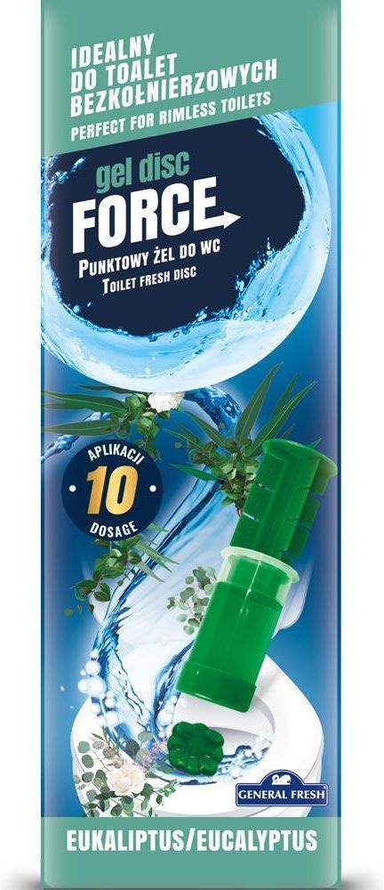 General Fresh Disc Force to idealne rozwiązanie do utrzymania higienicznej czystości i świeżości w toalecie, doskonałe do tradycyjnych i nowoczesnych misek WC. General Fresh Disc Force Eucalyptus, żelowe krążki do toalety, 60 ml Innowacyjna Higiena i Świeżość General Fresh Disc Force to nowoczesna alternatywa dla tradycyjnych zawieszek do WC. Punktowe żelowe krążki doskonale sprawdzają się zarówno w bezrantowych miskach WC, jak i w standardowych toaletach. Dzięki łatwej aplikacji i długotrwałemu działaniu, zapewniają higieniczną czystość i świeży zapach nawet do 10 tygodni. Specyfikacja produktu Nazwa produktu: General Fresh Disc Force Eucalyptus, żelowe krążki do toalety, 60 ml EAN produktu: 5900785170637 Producent: Global Cosmed S.A. Dystrybutor: Global Cosmed Group S.A., ul. Warszawska 7, 78-600 Wałcz, Polska Ilość produktu w opakowaniu / Pojemność: 60 ml (12 żelowych aplikacji po 5 ml) Marka produktu: General Fresh Rodzaj produktu: Produkt chemii gospodarczej Właściwości Higieniczna aplikacja – brak bezpośredniego kontaktu z toaletą Długotrwałe działanie – jedno opakowanie wystarcza na 10 tygodni świeżości Skuteczna ochrona – zapobiega osadzaniu się kamienia i zabrudzeń Intensywny zapach – odświeża powietrze w łazience Łatwa aplikacja – aplikator umożliwia precyzyjne i szybkie nałożenie żelowego krążka Idealne dla nowoczesnych toalet – doskonałe do WC bez kołnierza oraz klasycznych misek Stosowanie Usuń zatyczkę z aplikatora Naciśnij przycisk odpowiadający kolejnemu użyciu. Przystaw aplikator do wewnętrznej strony muszli toaletowej Powoli przesuwaj tłok, aż żelowy krążek zostanie naniesiony. Wyjmij aplikator i zamknij go zatyczką. Ostrzeżenia Przechowywać w miejscu niedostępnym dla dzieci. Unikać kontaktu z oczami i skórą – może powodować podrażnienie. W przypadku kontaktu z oczami – natychmiast przepłukać dużą ilością wody i zasięgnąć porady lekarza. Nie spożywać – produkt niebezpieczny w przypadku połknięcia. Po użyciu umyć ręce. Nie stosować na uszkodzonych powierzchniach sanitarnych. Przechowywać w temperaturze pokojowej, z dala od źródeł ciepła i bezpośredniego światła słonecznego. Produkt wyłącznie do użytku toaletowego. Zagrożenia i środki ostrożności:Produkt oznaczony jest piktogramem GHS07 – możliwe działanie drażniące , działa drażniąco na oczy, działa drażniąco na skórę, chronić przed dziećmi, dokładnie umyć ręce po użyciu, stosować rękawice ochronne/ ochronę oczu, W PRZYPADKU KONTAKTU ZE SKÓRĄ umyć dużą ilością wody, W PRZYPADKU DOSTANIE SIĘ DO OCZU- OSTROŻNIE PŁUKAĆ WODĄ PRZEZ KILKA MINUT. Wyjąć soczewki kontaktowe, jeżeli są i można je łatwo usunąć, nadal płukać. W PRZYPADKU WYSTĄPIENIA PODRAŻNIENIA SKÓRY zasięgnąć porady/ zgłosić się pod opiekę lekarza.