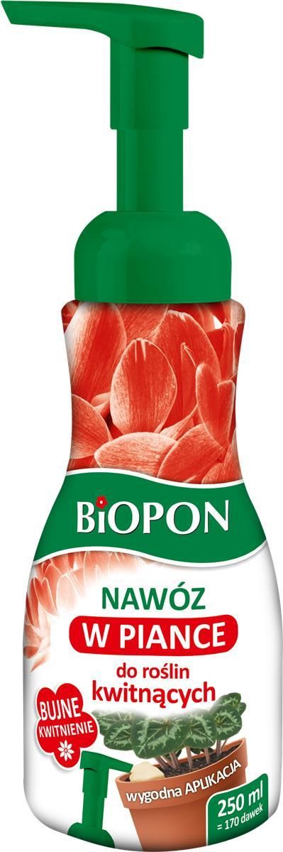 BIOPON NAWÓZ W PIANCE DO ROŚLIN KWITNĄCYCH Innowacyjny, gotowy do użycia nawóz w piance do kwitnących roślin ozdobnych. Dostarcza roślinom wszystkich niezbędnych składników odżywczych, zapewnia bujne kwitnienie i intensywne wybarwienie kwiatów. Wyjątkowo wydajny i wygodny w użyciu – aplikuje się go bezpośrednio do doniczki, bez konieczności odmierzania odpowiedniej dawki. PARAMETRY Pojemność: 0,25l Wydajność: 170 dawek Okres stosowania: całym rokiem Rodzaj: nawóz w piance Opakowanie: butelka z atomizerem Najważniejsze zalety nawozów w piance Gotowe do użycia - Rewelacyjny nawóz do kwiatów w piance, który aplikuje się jednym kliknięciem; Bez rozcieńczania - bez odmierzania, rozlewania i rozsypywania! Piękny i zdrowy wygląd zasilanych roślin - Można z powodzeniem używać ich do wszelkiego rodzaju roślin zielonych, kwitnących i storczyków; Bardzo wydajne - jedno opakowanie 250 ml wystarczy aż na 170 aplikacji nawozu; Wygoda i szybkość stosowania - nawóz stosuje się podczas podlewania rośliny. Jedną konewką można podlać kwiaty nawożone nawozem w piance oraz te, które nie potrzebują w tym momencie zasilenia; Kompleksowa pielęgnacja i odżywianie - zapewnia intensywny wzrost i zdrowy wygląd zasilanych roślin;