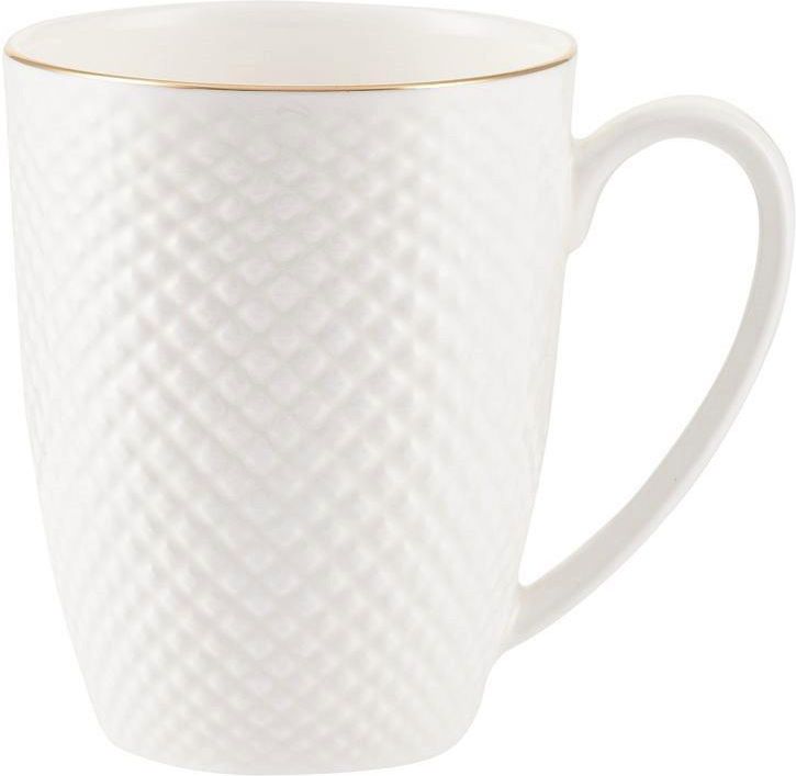 Villa Italia Kubek 350 ml Bari Gold Kubek 350 ml Bari Gold - Villa Italia Bardzo ładny i praktyczny kubek do herbaty lub kawy. Pochodzi z linii Bari gold - to kolekcja najwyższej jakości porcelany kostnej - cienkiej i delikatnej, w odcieniu mlecznobiałym. Naczynia zdobione są złotą linią na obrzeżach, malowaną ręcznie. Linia Bari gold zaprojektowana została dla osób ceniących prostą elegancję oraz komfort użytkowania. Okrągły fason i delikatne zdobienie w formie drobnej kosteczki sprawiają, że kolekcja świetnie komponuje się zarówno z klasyczną, jak i nowoczesną aranżacją stołu. Duże talerze oraz dość pojemne filiżanki i kubki z wygodnymi uchwytami są bardzo praktyczne. Można bezpiecznie myć w zmywarce. Wymiary kubka średnica: 8 cm wysokość: 10 cm pojemność: 350 ml waga: 0,25 kg kolor: mlecznobiały Villa Italia to marka wysokiej jakości porcelany stołowej, szkła, sztućców oraz innych dodatków. Porcelna projektowana jest Mediolanie, a kolekcje tworzą serwisy obiadowe i herbaciane, które wyróżnia niespotykana biel, wyjątkowo gładkie szkliwo oraz piękne wzornictwo. Jakość całości podnosi ręczne zdobienie. Produkty Villa Italia kierowane są do klientów o niebanalnym guście, ceniących sobie jakość, walory estetyczne, jak również praktyczność.