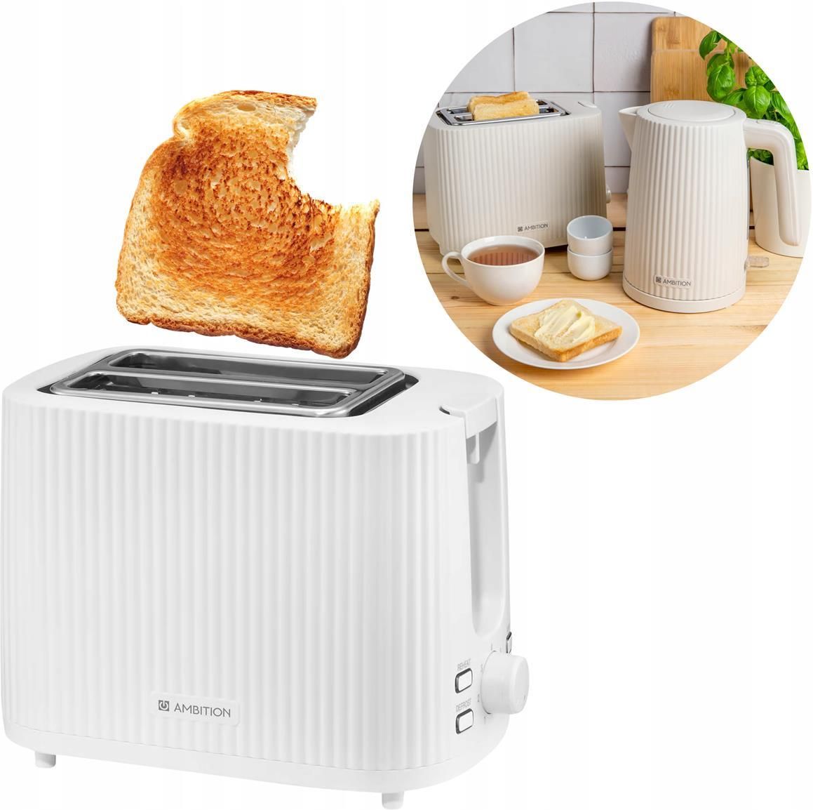 Toster elektryczny 930W Toster elektryczny Curly marki Ambition w eleganckim białym kolorze to stylowe i funkcjonalne urządzenie, które ułatwi codzienne przygotowanie śniadań. Wyposażony w 2 komory do opiekania pieczywa, 7-stopniową regulację czasu opiekania oraz funkcje takie jak rozmrażanie, podgrzewanie i przerywanie opiekania, toster zapewnia pełną kontrolę i wszechstronność. Dodatkowo, automatyczne centrowanie pieczywa gwarantuje równomierne opiekanie, a wyjmowana tacka na okruchy oraz miejsce na przewód ułatwiają utrzymanie urządzenia w czystości i porządek w kuchni. Nowoczesny design: Białe wykończenie z dekoracyjnymi żłobieniami pasuje do eleganckich i minimalistycznych wnętrz. Funkcjonalność: 2 komory pozwalają opiekać jednocześnie dwie kromki chleba lub bułeczki. Precyzyjna regulacja: 7-stopniowa kontrola opiekania dostosuje poziom przypieczenia do indywidualnych preferencji. Wszechstronność: Funkcje rozmrażania, podgrzewania i przerywania opiekania zwiększają możliwości urządzenia. Łatwe czyszczenie: Wyjmowana tacka na okruchy upraszcza utrzymanie tosteru w czystości. Stabilność i wygoda: Antypoślizgowe nóżki i miejsce na przewód gwarantują porządek i bezpieczeństwo.