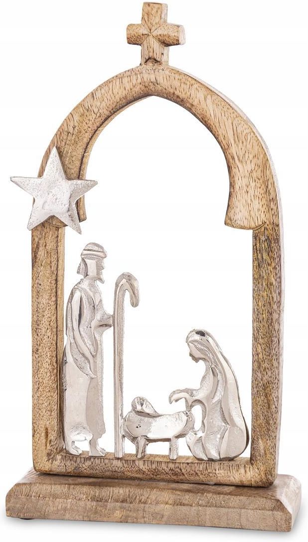 Figurka Szopka Bożonarodzeniowa z Drewna Mango i Metalu – 27 cm – Elegancka dekoracja świąteczna Elegancka i stylowa figurka szopki bożonarodzeniowej, która idealnie łączy naturalne drewno mango z metalowymi postaciami, tworząc harmonijną i subtelną dekorację świąteczną. Ta minimalistyczna kompozycja przedstawia Świętą Rodzinę: Maryję, Józefa oraz Dzieciątko Jezus w żłóbku, otoczonych prostą, drewnianą ramą w kształcie łuku z krzyżem na szczycie. Nad postaciami unosi się metalowa gwiazda, symbolizująca Gwiazdę Betlejemską, która dodaje całości delikatnego blasku. Parametry techniczne Wymiary: 27 cm wysokości, 15 cm szerokości, 5 cm głębokości Kolor: Naturalny brąz drewna mango, metalowe postacie w kolorze srebrnym Materiał: Drewno mango, metal Zalety produktu Minimalistyczny, elegancki design, idealny do każdego wnętrza Wykonana z trwałych, naturalnych materiałów: drewna mango i metalu Kompaktowy rozmiar, doskonały do małych i średnich przestrzeni Idealna na prezent bożonarodzeniowy, wprowadzająca wyjątkowy klimat świąt Stylowa dekoracja, która może stać się częścią Twoich świątecznych tradycji Zastosowanie Figurka szopki bożonarodzeniowej jest doskonałą dekoracją świąteczną do salonu, jadalni lub biura. Jej elegancki, minimalistyczny styl wprowadzi do Twojego wnętrza świąteczny nastrój bez przytłaczania przestrzeni. Może być również wspaniałym prezentem dla miłośników subtelnych i stylowych dekoracji bożonarodzeniowych. Wykonana z wysokiej jakości drewna mango, rama szopki ma ciepły, naturalny odcień brązu, który doskonale kontrastuje ze srebrnymi, metalowymi sylwetkami postaci. Dzięki solidnym materiałom figurka będzie nie tylko piękną ozdobą na święta, ale także trwałą pamiątką na wiele lat. Ta subtelna szopka idealnie wpasowuje się w nowoczesne i klasyczne wnętrza, dodając elegancji i świątecznego ciepła. Postaw ją na komodzie, parapecie lub świątecznym stole, aby stworzyć magiczny, bożonarodzeniowy nastrój.