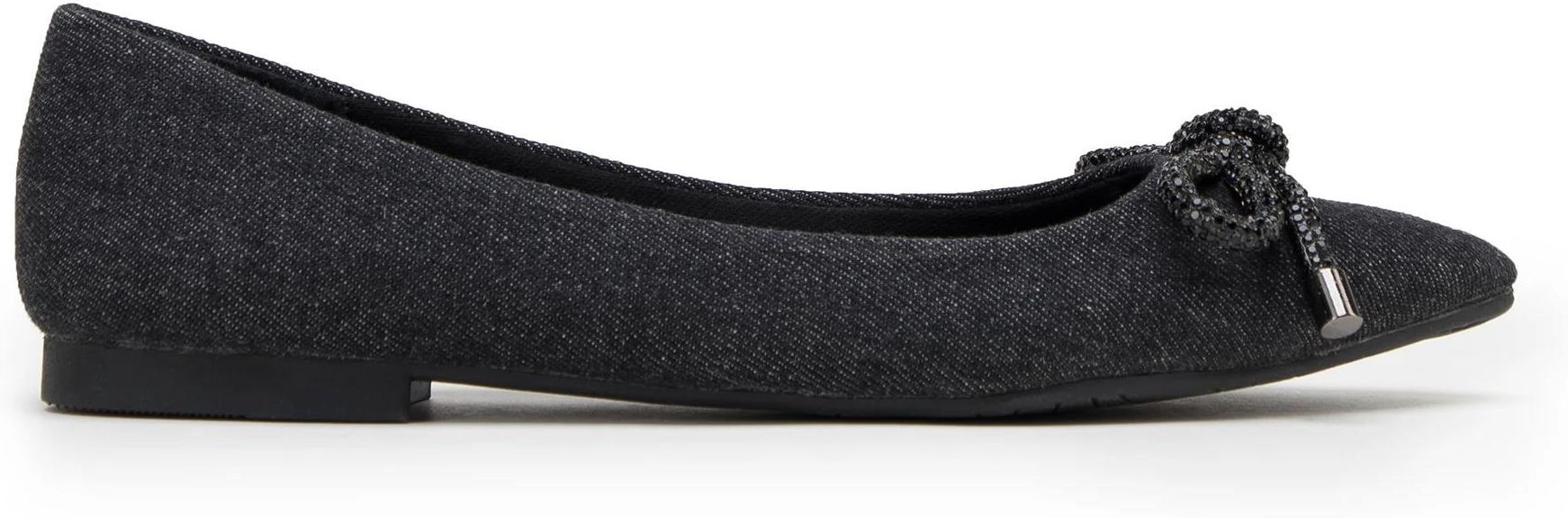 Damskie buty na płaskim obcasie. Dżinsowe balerinki to modny dodatek, który przyciągnie niejedno spojrzenie. Nosek w szpic zdobi błyszcząca kokarda z drobnych koralików. Buty mają miękką, wyprofilowaną wkładkę i płaski obcas, dzięki czemu wygodnie będzie w nich chodzić nawet przez cały dzień. Będą świetnym dopełnieniem i ulubionej minisukienki, i dżinsów i koszuli na co dzień. Baleriny dżinsowe z błyszczącą kokardą to klasyka w nowoczesnym wydaniu, która przyda Ci się na wiele okazji.Nasza rada: dobierz do nich błyszczące dodatki pod kolor kokardy. tworzywo sztuczne; wkładka i wyściółka z tworzywa sztucznego; podeszwa z tworzywa sztucznego; nosek w szpic; ozdobna błyszcząca kokarda. materiał syntetyczny materiał syntetyczny materiał syntetyczny