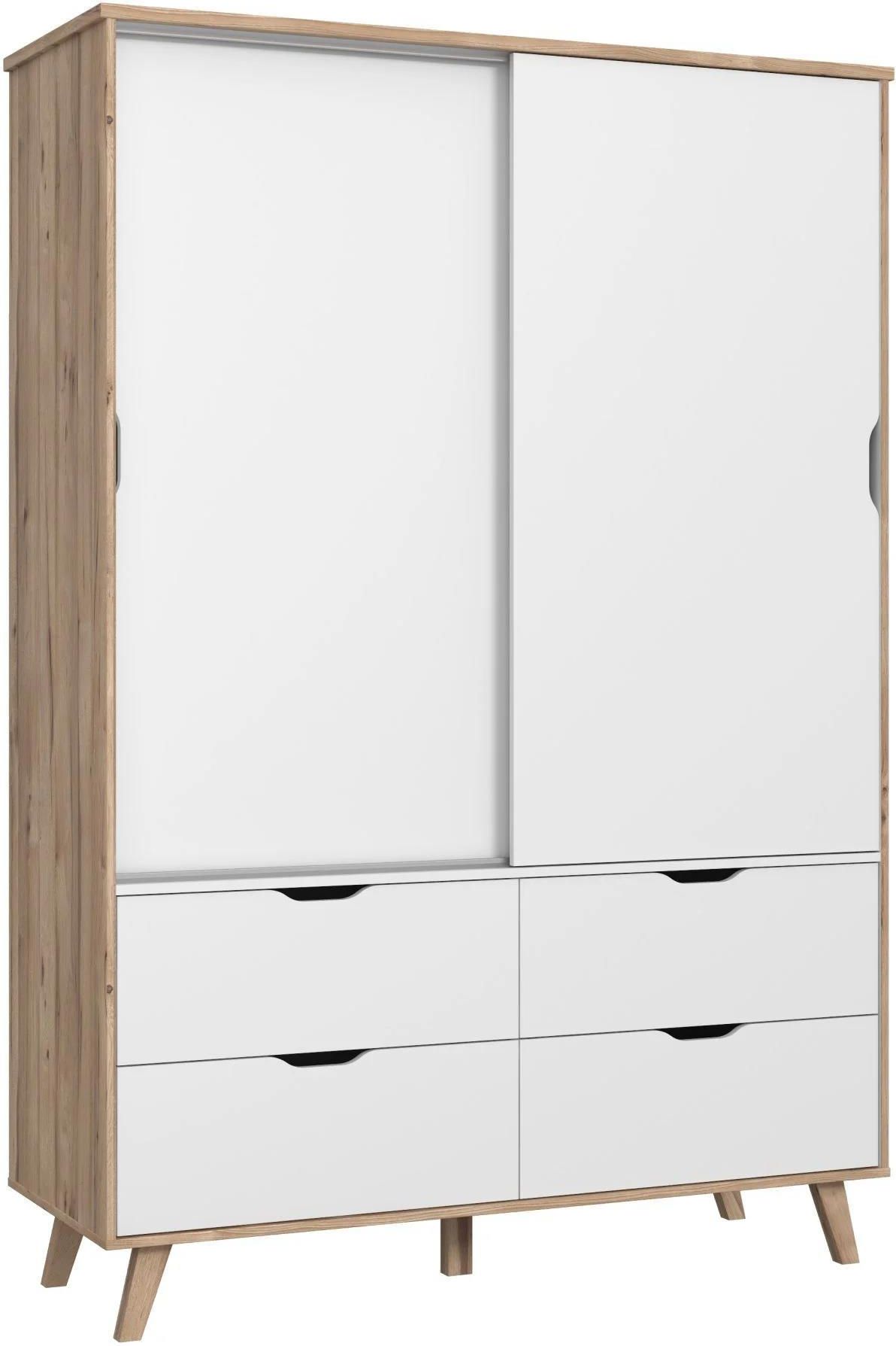 Szafa ubraniowa z kolekcji Vankka, od Meble Forte, doskonale sprawdzi się w pokoju dziecięcym i młodzieżowym. Mebel oferuje użytkownikowi zarówno obszerne półki, jak i drążek na wieszaki. Jego atut stanowi także obecność szuflad, w których można przechowywać wygodnie bieliznę i drobne akcesoria, utrzymując porządek wśród posiadanych elementów garderoby. Jak zbudowana jest szafa do sypialni Vankka? Szafa z szufladami Vankka została wykonana z wysokiej jakości płyty meblowej, wzmocnionej obrzeżami ABS. Mebel jest dzięki temu odporny na uszkodzenia mechaniczne i bardzo łatwy do utrzymania w czystości. Korpus szafy osadzono na wysokich nóżkach, które dodają jej optycznej lekkości i elegancji. Wnętrze mebla zagospodarowano natomiast przy pomocy szuflad, półek i drążka odzieżowego. Na frontach szafy użytkownik znajdzie również podfrezowane uchwyty, które ułatwiają wysuwanie szuflad i przesuwanie drzwiczek mebla. Jak prezentuje się szafa dwudrzwiowa Vankka? Nowoczesna szafa na nóżkach Vankka to jasny, rozświetlający wnętrze mebel, wybarwiony na kolor dębu i bieli. Takie połączenie - typowe dla stylu skandynawskiego - sprawia, że szafa optycznie powiększa pomieszczenie, dzięki czemu sprawdzi się nawet w niewielkiej sypialni. Dekor drewna wprowadza do aranżacji ciepły motyw natury, a czysta biel odświeża i dodaje elegancji. Wysokie nóżki szafy to kolejny element nadający meblowi szyk, ale także ułatwiający utrzymanie czystości na podłodze. Szafa sprawdzi się doskonale w każdej sypialni, w tym również w sypialni młodzieżowej. Wymiary szafy Szerokość: 139,4 cm Głębokość: 52,7 cm Wysokość: 201,5 cm