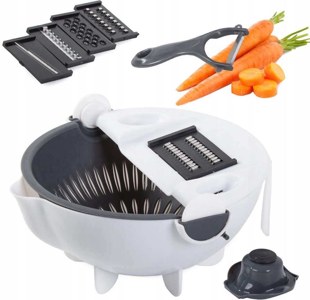 KRAJALNICA SZATKOWNICA DO WARZYW Z MISKĄ CEDZAK WIELOFUNKCYJNA TARKA SITKO 3 W 1 Wielofunkcyjny obrotowy zestaw do krojenia warzyw 3 w 1. Posłuży nam jako tarka, cedzak i miska.Tarka perfekcyjnie pokroi i utrze warzywa/owoce na pyszną sałatkę. Zestaw wyposażony w obrotowy ociekacz ułatwi pracę, gdyż od razu po krojeniu możemy odcedzić warzywa z nadmiaru wody. W misce możemy przygotować ulubioną sałatę lub inne danie. Do zestawu dołączonych jest pięć wymiennych ostrzy, uchwyt do trzymania i obieraczka. Wszystkie ostrza wykonane ze stali nierdzewnej. Wymiana ostrzy jest bardzo prosta i szybka. TARKA WYPOSAŻONA JEST W 5 RÓŻNYCH OSTRZY: ✅ Ostrze cienkie paski ✅ Ostrze grubsze paski ✅ Ostrze do ucierania ✅ Ostrze do krojeni ✅ Ostrze do robienia fali SPECYFIKACJA TECHNICZNA: ✅ Kod produktu: 15769 ✅ Materiał wykonania: tworzywo sztuczne, stal ✅ Pięć różnych ostrzy ✅ Wygodna nakładka do trzymania produktów ✅ Miska z funkcją sitka obrotowego ✅ Wygodny uchwyt ✅ Łatwa w czyszczeniu ✅ Poręczna obieraczka do warzyw ✅ Solidna konstrukcja ✅ Obieraczka ✅ Wymiary: 21 x 10,5 cm ✅ Kolor: biały ZESTAW ZAWIERA: ☑️ Fabrycznie nową tarkę do warzyw i owoców ☑️ Miska ☑️ Sitko obrotowe ☑️ Obieraczkę do warzyw ☑️ Nakładka do trzymania produktów ☑️ Pięć wymiennych ostrzy ☑️ Oryginalne opakowanie
