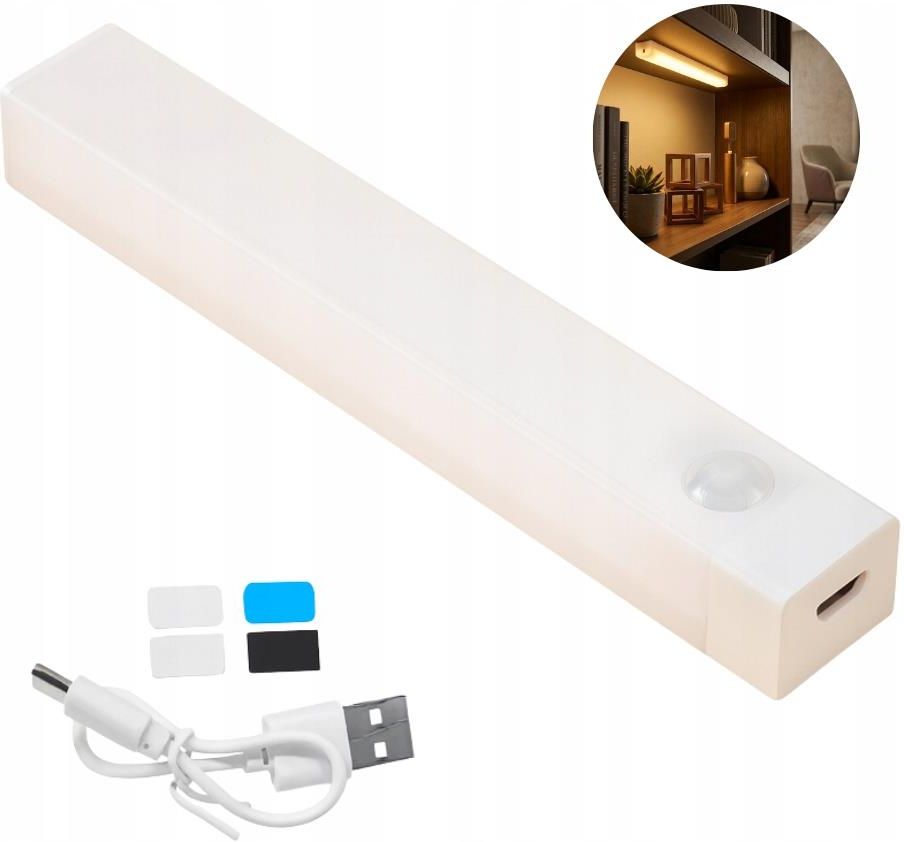 Funkcjonalna Lampa Podszafkowa LED TSG-358 20 cm do Kuchni (Z Czujnikiem Ruchu) Kompaktowa Lampa Podszafkowa LED TSG-358 o długości 20 cm to nowoczesne i inteligentne rozwiązanie, które dostarcza lokalne, miękkie oświetlenie tam, gdzie jest najbardziej potrzebne, łącząc minimalizm z wydajnością. Wyposażona w czujnik ruchu oraz możliwość ładowania przez USB, lampa działa całkowicie autonomicznie, zapewniając wygodę w nocy bez użycia baterii. Emitując przyjemne, ciepłe światło, jest idealna do szaf, garderób, wnęk kuchennych i korytarzy, tworząc przytulną i bezpieczną atmosferę. Sercem tej funkcjonalnej lampy podszafkowej jest wbudowany czujnik ruchu (podczerwień), który reaguje na obecność w ciemności, automatycznie włączając światło tylko wtedy, gdy jest to konieczne, co znacząco oszczędza energię akumulatora. Dzięki mobilnej konstrukcji i ładowaniu USB (z laptopa, powerbanka lub adaptera), lampa jest bezprzewodowa i uniwersalna, eliminując potrzebę skomplikowanego okablowania. Kompaktowy format 20 cm sprawia, że łatwo zmieści się nawet w wąskich, ograniczonych przestrzeniach mebli kuchennych, szuflad czy schowków samochodowych. Delikatne Oświetlenie i Beznarzędziowy Montaż Lampa Podszafkowa LED TSG-358 Diody LED generują jednostajne, miękkie, ciepłe światło, które jest przyjemne dla oczu, nie oślepia i czyni przestrzeń bardziej przytulną, stanowiąc doskonałe nocne oświetlenie uzupełniające. Lampa jest zaprojektowana z myślą o maksymalnej prostocie montażu – w zestawie znajdują się magnetyczne lub samoprzylepne uchwyty, które pozwalają na szybką instalację na metalu, drewnie czy płytkach w ciągu kilku sekund. W razie potrzeby, łatwo ją odłączyć od uchwytów w celu naładowania, co jest szczególnie praktyczne w garderobach, spiżarniach i nad zlewem. Główne Korzyści Lampy LED TSG-358 20 cm Inteligentne Oszczędzanie:Automatyczne włączanie/wyłączanie dzięki czujnikowi ruchu w ciemności. Maksymalna Mobilność:Ładowanie USB i brak kabli gwarantują pełną autonomiczność w każdym miejscu. Komfortowe Światło:Miękka, ciepła barwa jest idealna do nocnego użytku i nie podrażnia wzroku. Dopasowanie do Wnętrz:Długość 20 cm sprawia, że jest dyskretna i kompaktowa w małych szafkach. Bezinwazyjny Montaż:Szybka instalacja za pomocą magnetycznych mocowań bez użycia wiertarki. Wielofunkcyjność: Nadaje się do kuchni, korytarzy, szaf, a nawet bagażnika samochodowego.