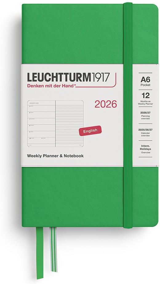 Planer tygodniowy na rok 2026 z notatnikiem Leuchtturm1917 (A6) Planer tygodniowy Leuchtturm1917 w rozmiarze Medium (A6) w kolorze Spring Leaf. Stworzony z myślą o tych, którzy cenią dobrą organizację i elegancję. Cały tydzień znajduje się na jednej stronie (7 dni na stronie), a obok dołączona jest dodatkowa strona na notatki - – idealna na zadania, pomysły czy listy. Planer tygodniowy rozpoczyna się od stycznia 2026 i kończy na grudniu 2026 roku. Dodatkowo zawiera przegląd roku 2026, 2027 i 2028 i planer projektów. Przy datach umieszczono fazy księżyca i święta międzynarodowe. W twardej oprawie z rozkładaną kieszenią na notatki w okładce, dwoma wstążkowymi zakładkami dla lepszej organizacji i naklejkami do archiwizacji. Dodatkowe perforowane strony na notatki, pozwalające na czyste wyrwanie. Elastyczne zamknięcie. Szyty grzbiet umożliwiający wygodne, płaskie otwarcie. Bezkwasowy papier 80g/m2 doskonały do pisania piórem wiecznym. Rozmiar: Pocket (A6) 90 x 150 mm.